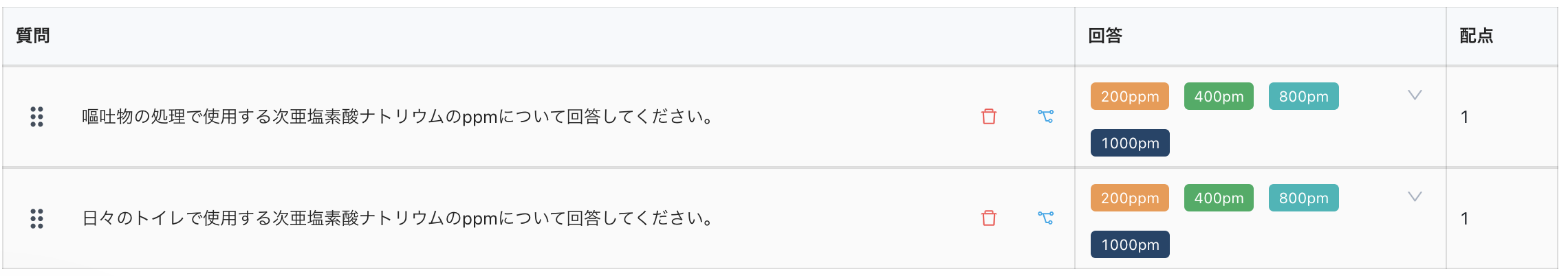 1問あたり1点の配点を振り分けることで、擬似的に、20問であれば20点満点、50問であれば50点満点のテストを作成することが可能です。