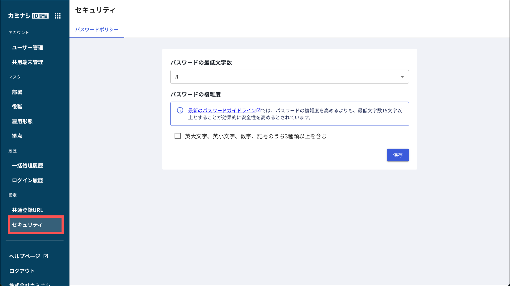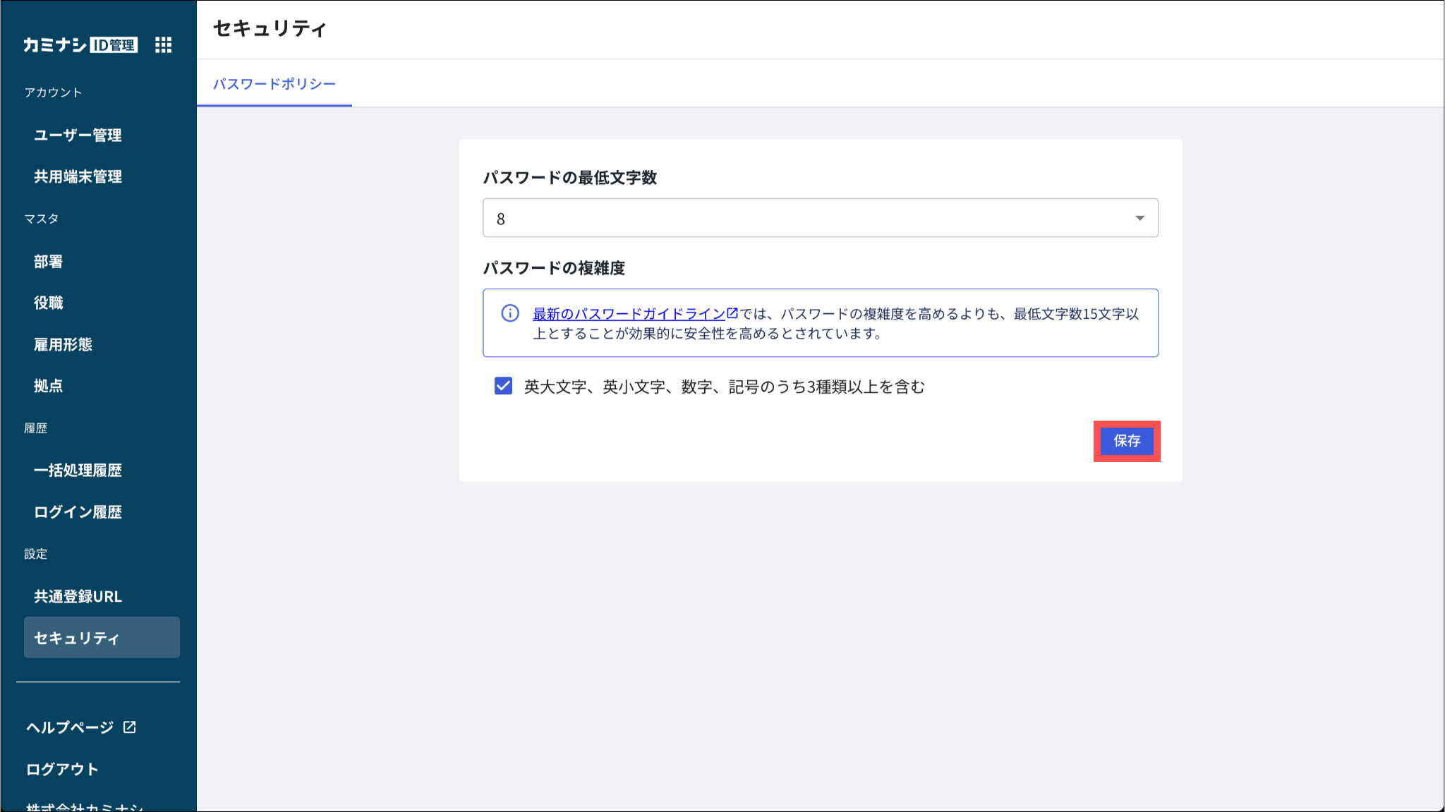 パスワードの最低文字数は8文字(デフォルト値)から20文字の範囲で設定できます。