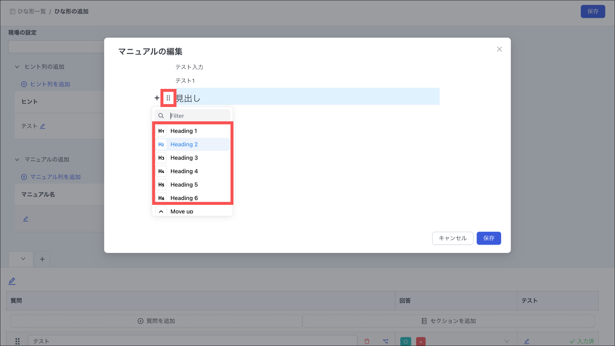 「+」から「Heading」を選択した後、赤枠内の6つの点を押すと、見出しに設定した文字の大きさを変更することができます。