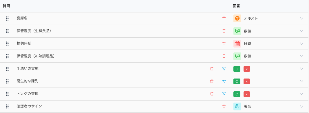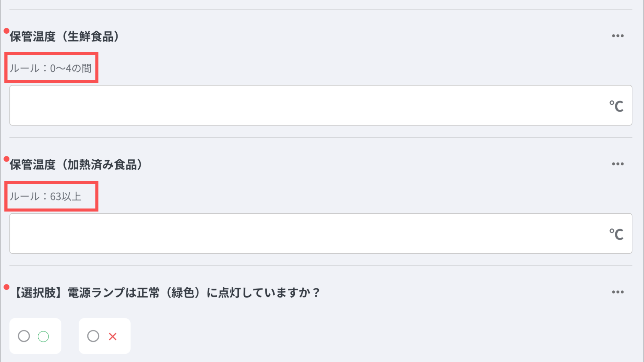 ビュッフェ形式で提供する食事には、保管温度や提供時間に基準が設けられています。この基準をあらかじめカミナシに設定しておくことで、どの記録者でも異常に気付ける仕組みが作れます。特にパートやアルバイトなどスタッフの入れ替わりが多い現場で有効です。