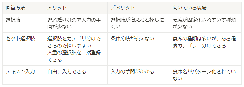 ホテル内のレストランや宴会場によって、宴席名がある程度固定化されているパターンや、日々異なるパターンがあります。以下に各入力方法の特徴をまとめましたので、現場によってどの形式が入力しやすいか試してみましょう。