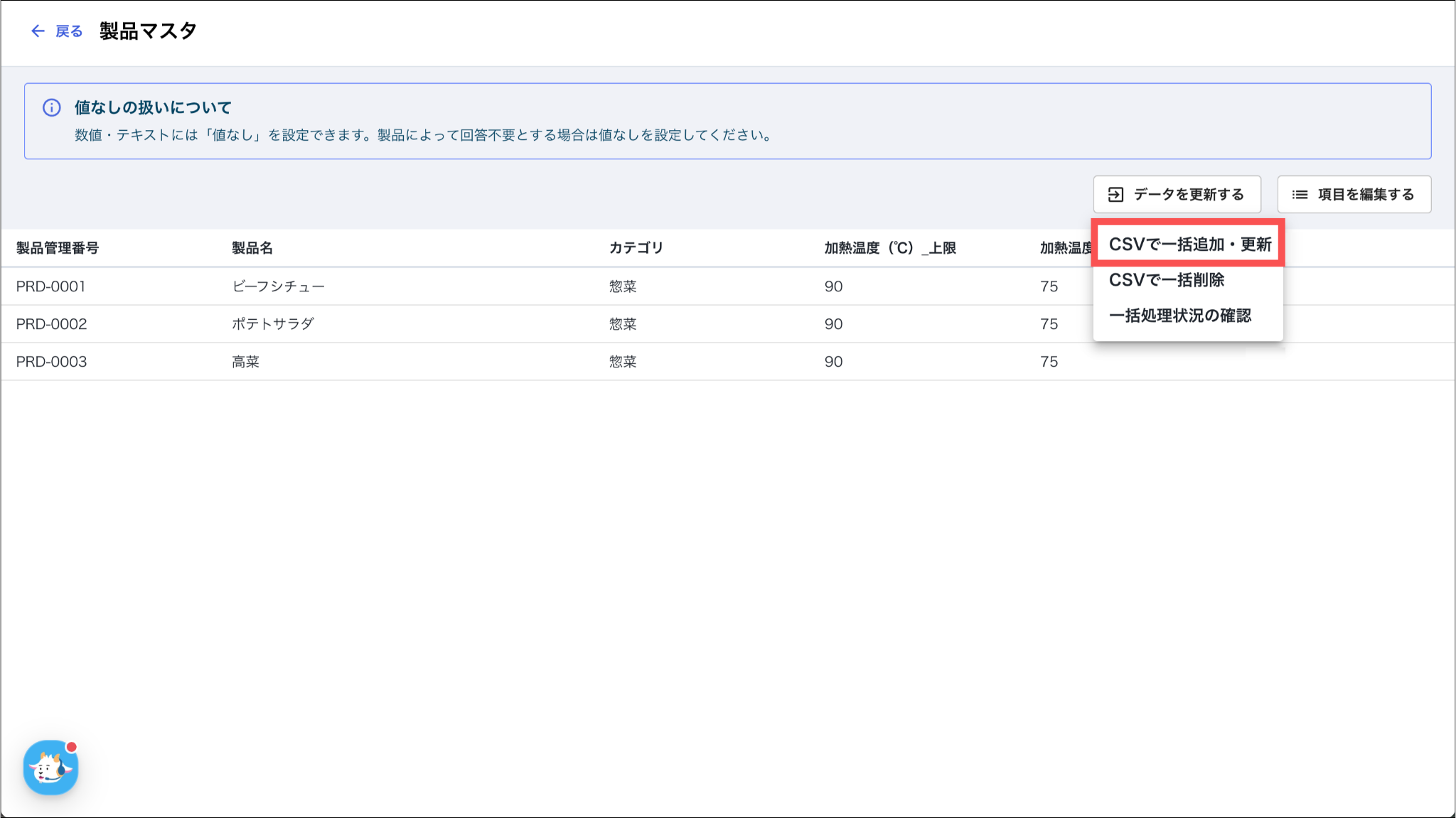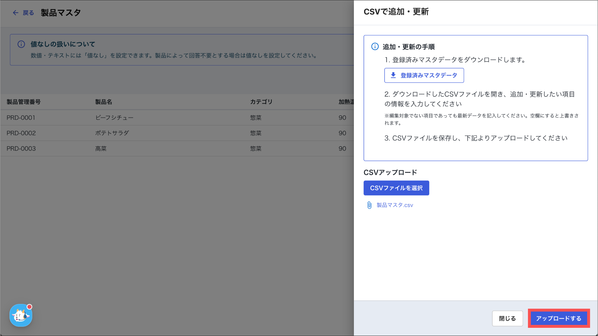 一度のCSVアップロードで、「新しく製品を追加すること」と「登録済みの製品情報を更新すること」を同時に行えます。