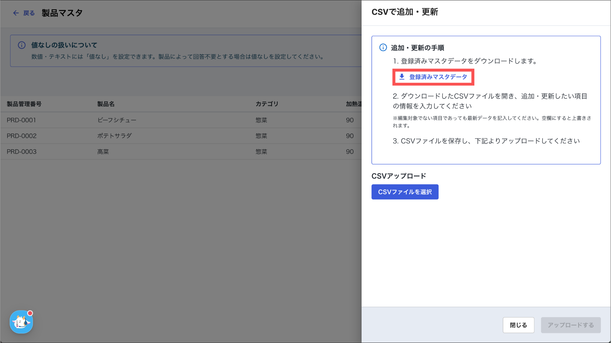 管理画面に登録されていない新しい製品管理番号がCSVファイルにある場合、新しい製品として追加されます。