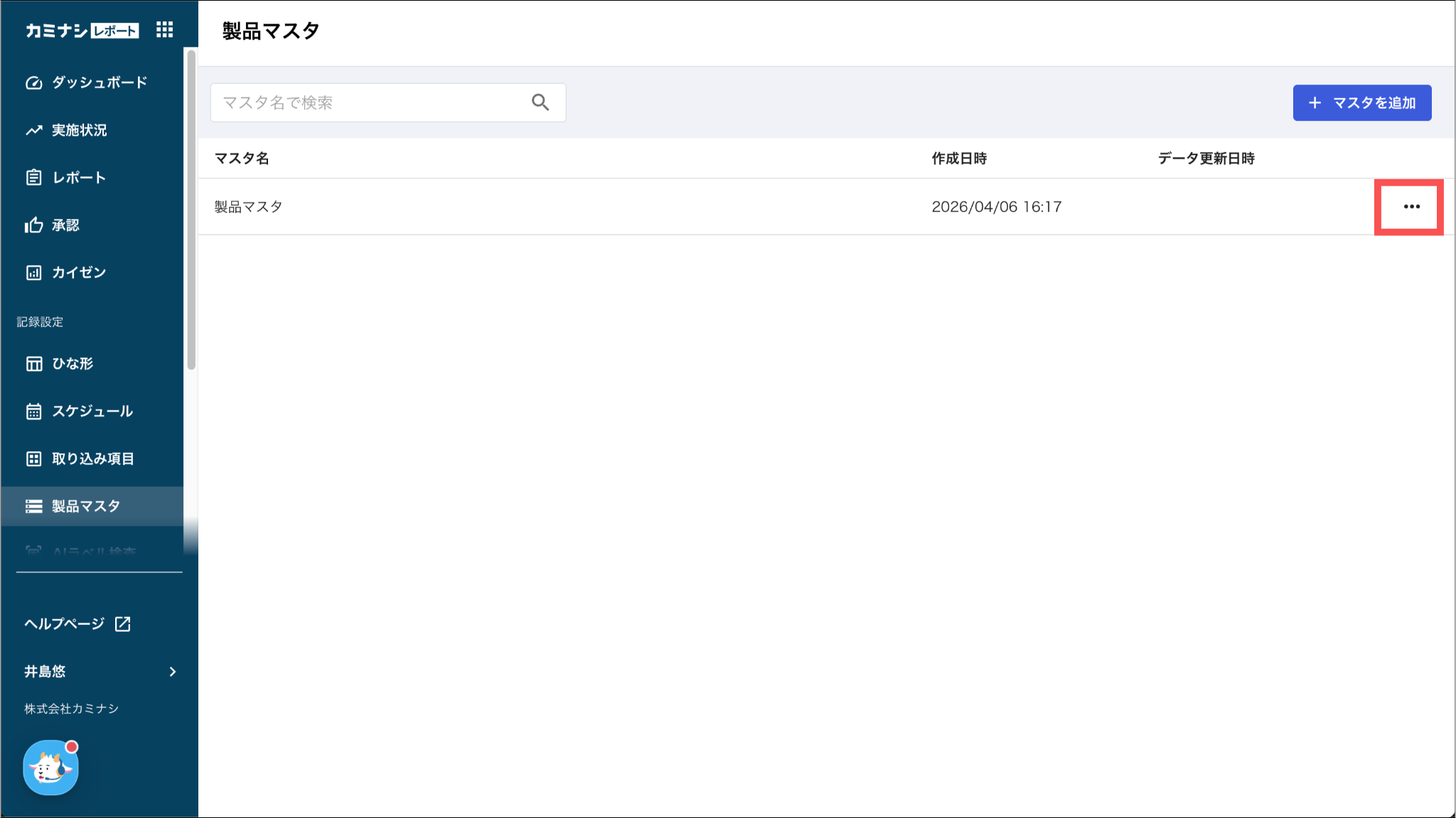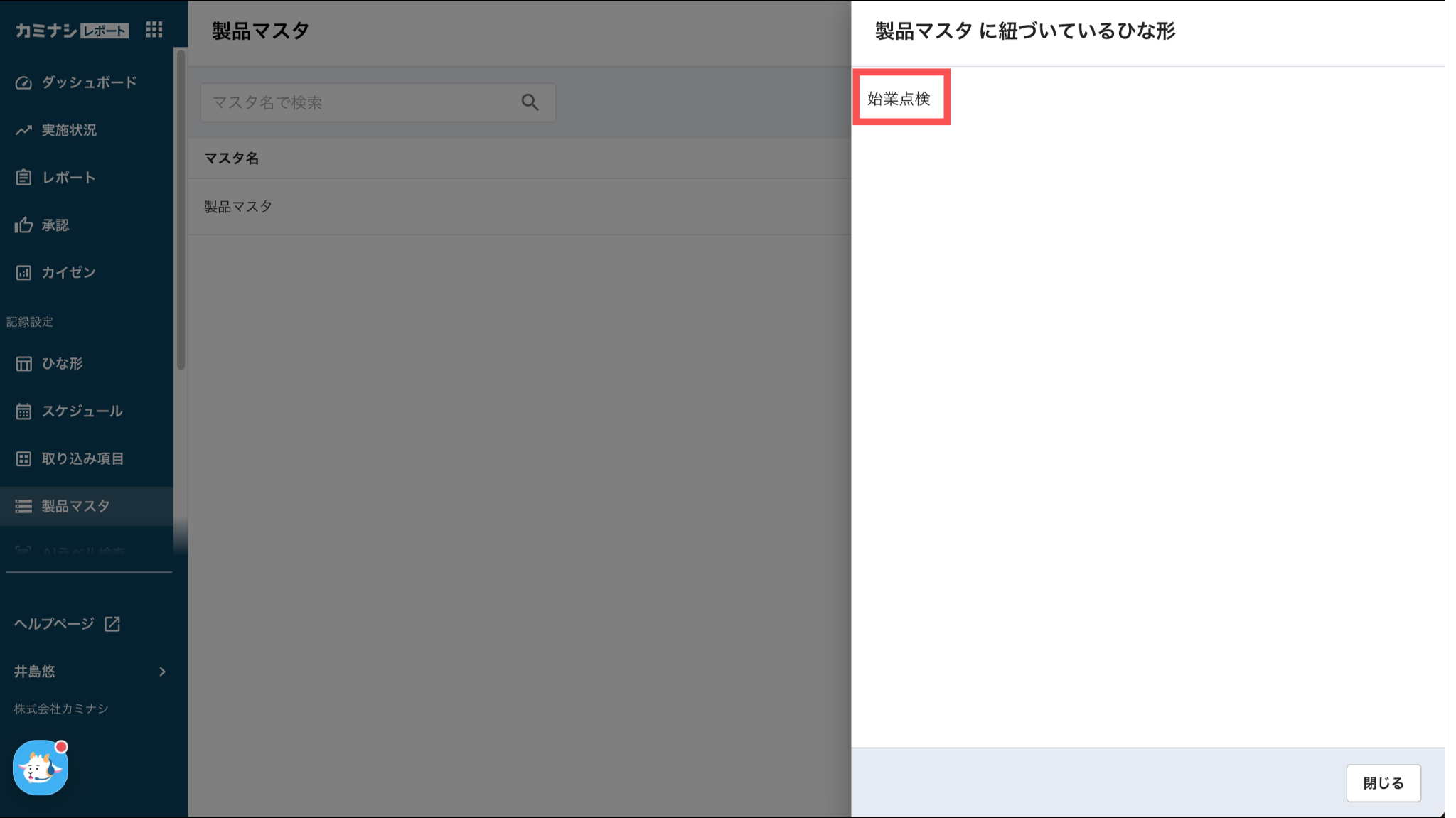 1.カミナシレポート 管理画面にログインする2.「製品マスタ」を開き、確認するマスタの「⋯」を押す3.「紐づいているひな形を確認」を押す4.ひな形を確認する表示されているひな形を押すと、ひな形編集画面を開くことができます。よくある質問は、こちらからご確認ください。