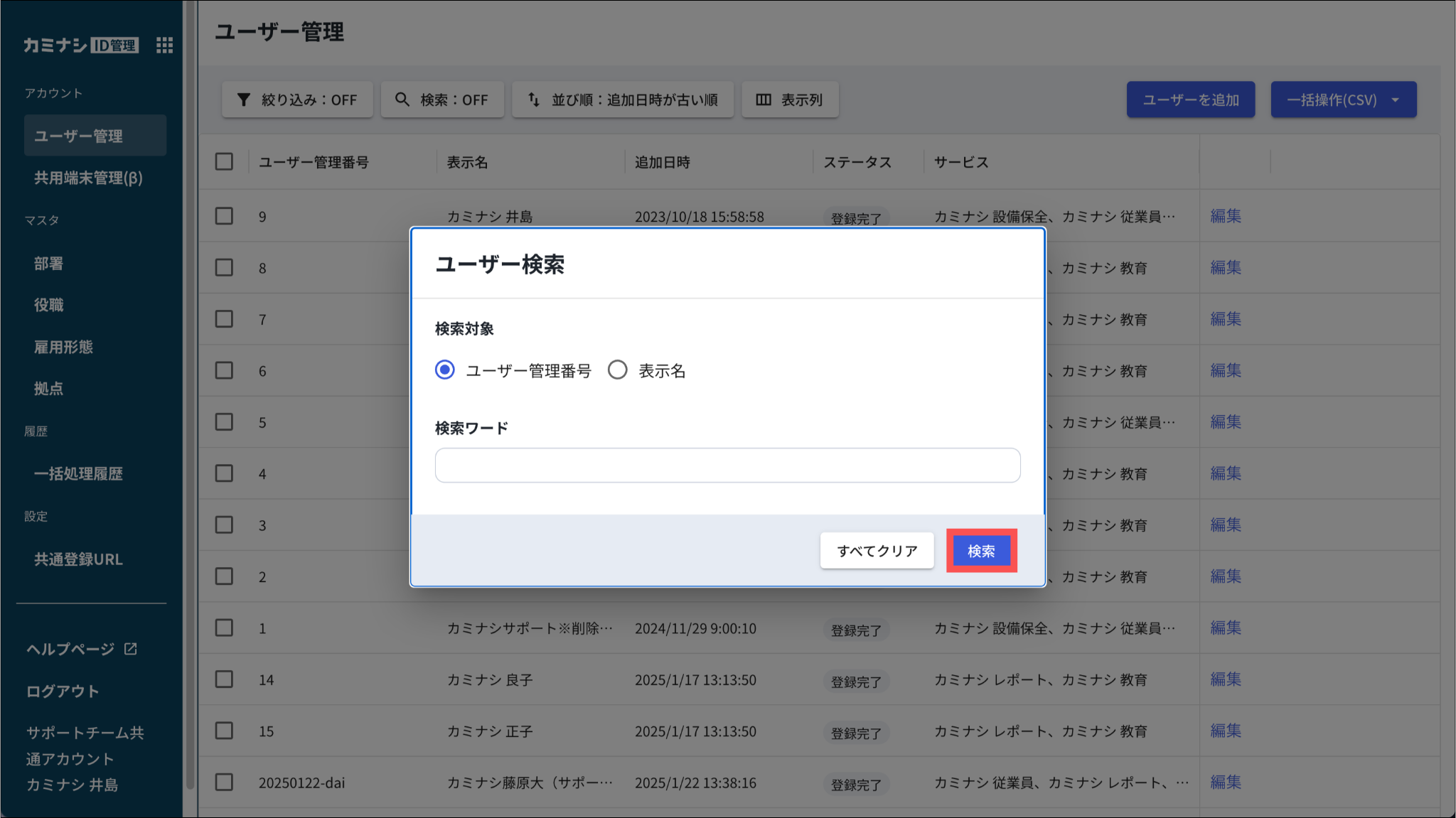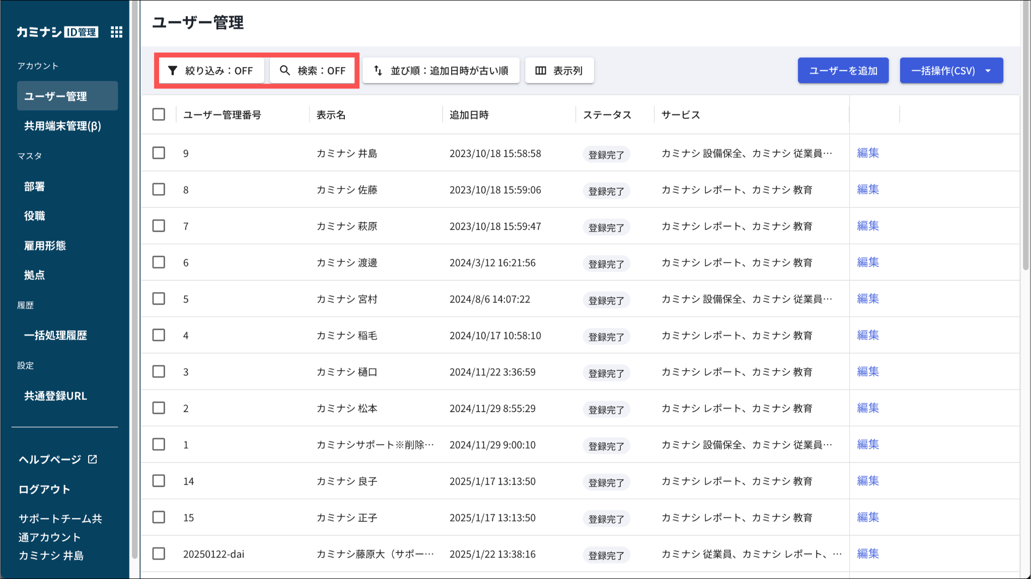 マスタ(部署・役職・雇用形態・拠点)や登録ステータス、利用サービスで絞り込みできます。
