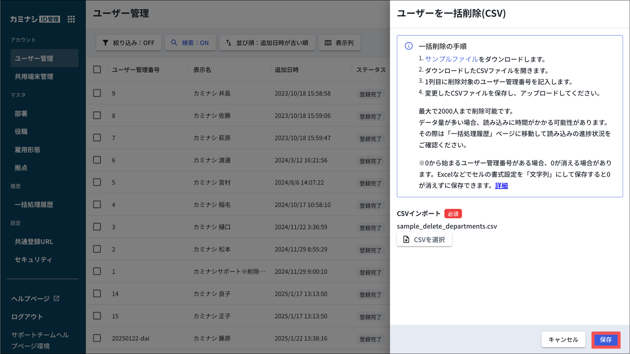 削除されたユーザーは、すぐにカミナシのサービスを利用できなくなり復元できませんのでご注意ください。