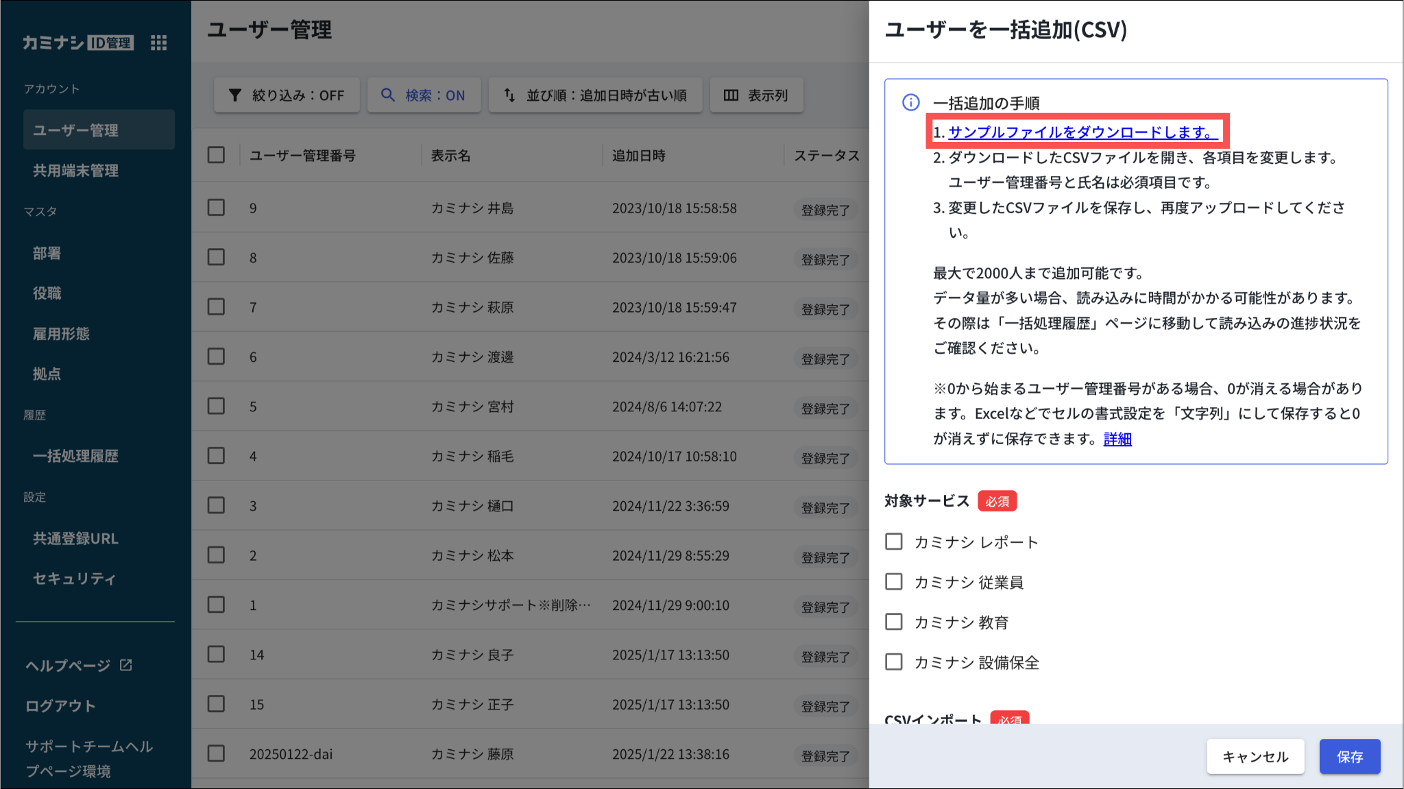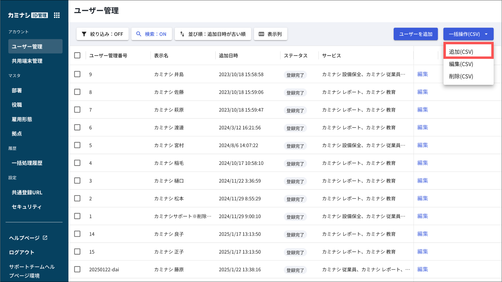 CSVファイルを使った一括登録では、主務の部署を設定することができます。
