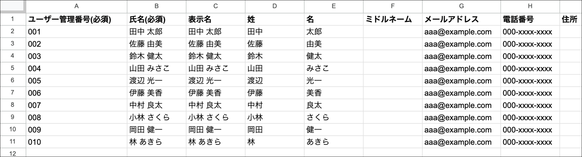 CSVファイルの1行目にある項目名は消さず、2行目以降にデータを入力します。