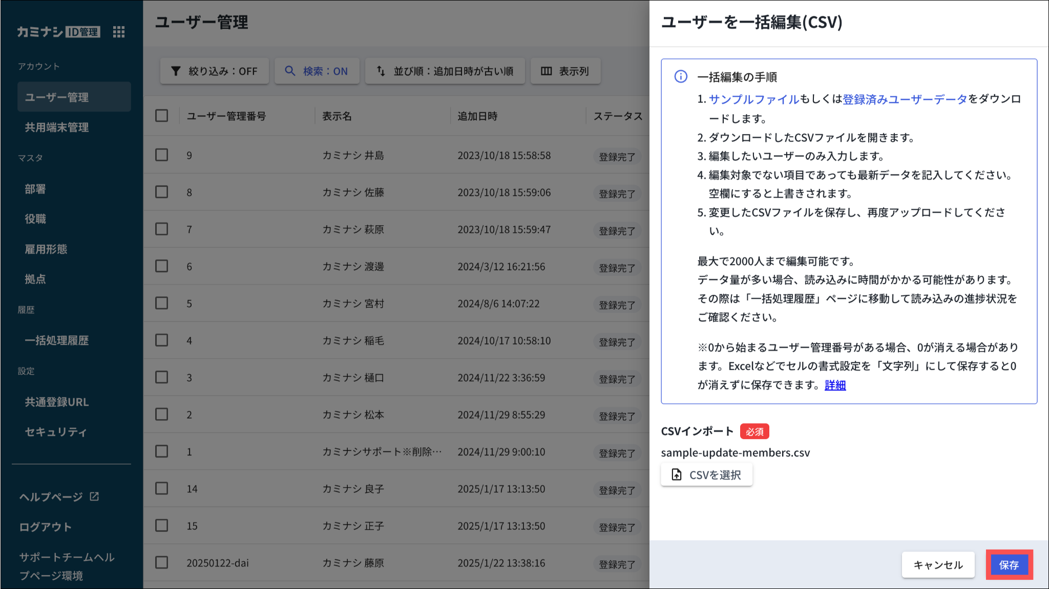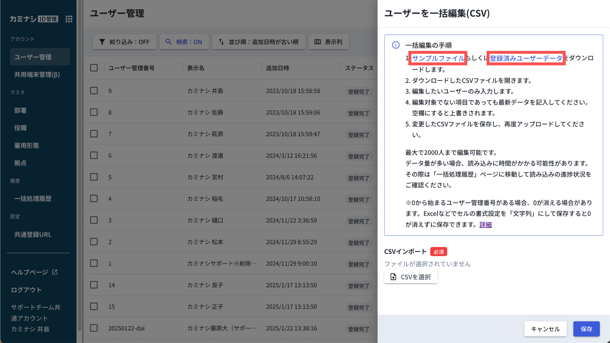 なお、本機能ではCSVファイル内の「ユーザー管理番号」を起点に、記載されているユーザー情報を一括で更新します。