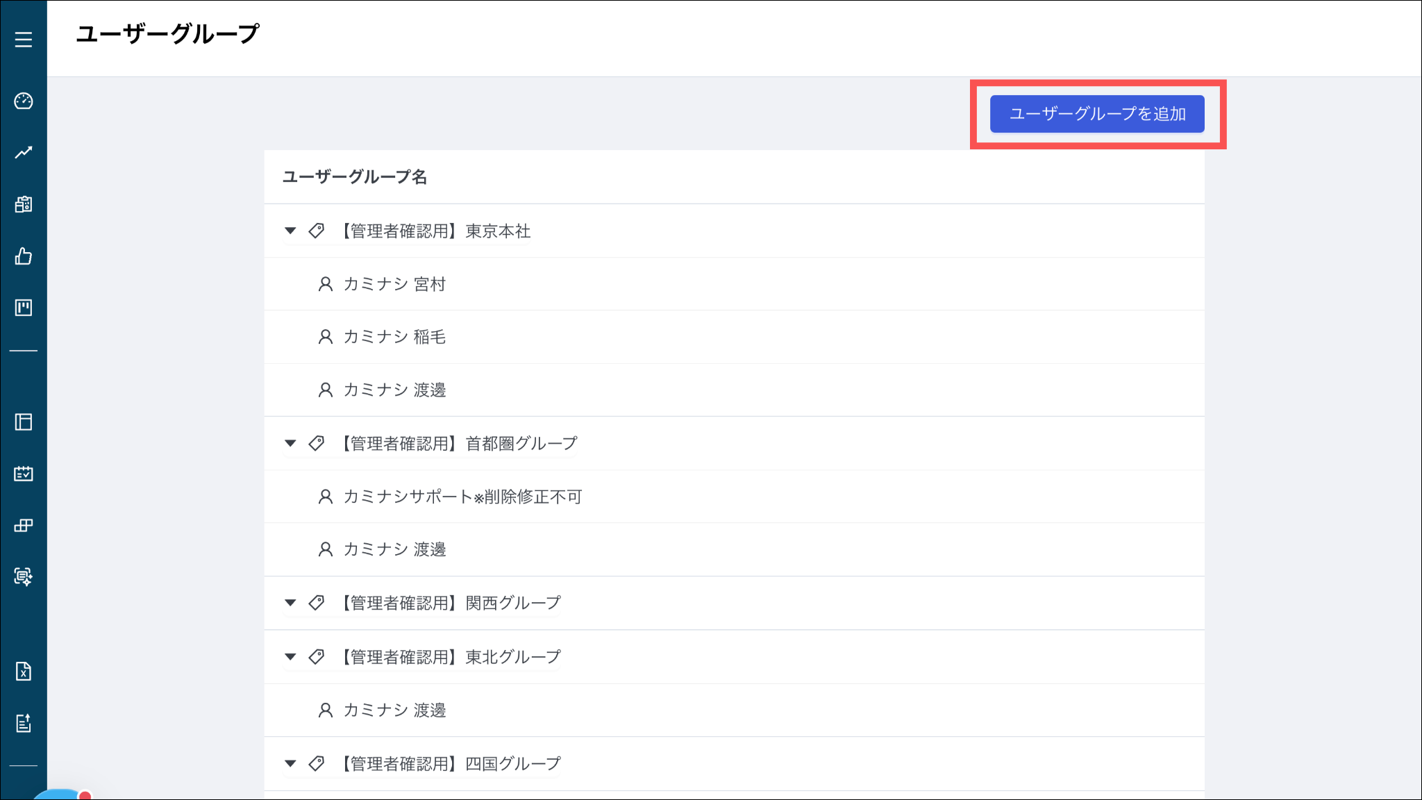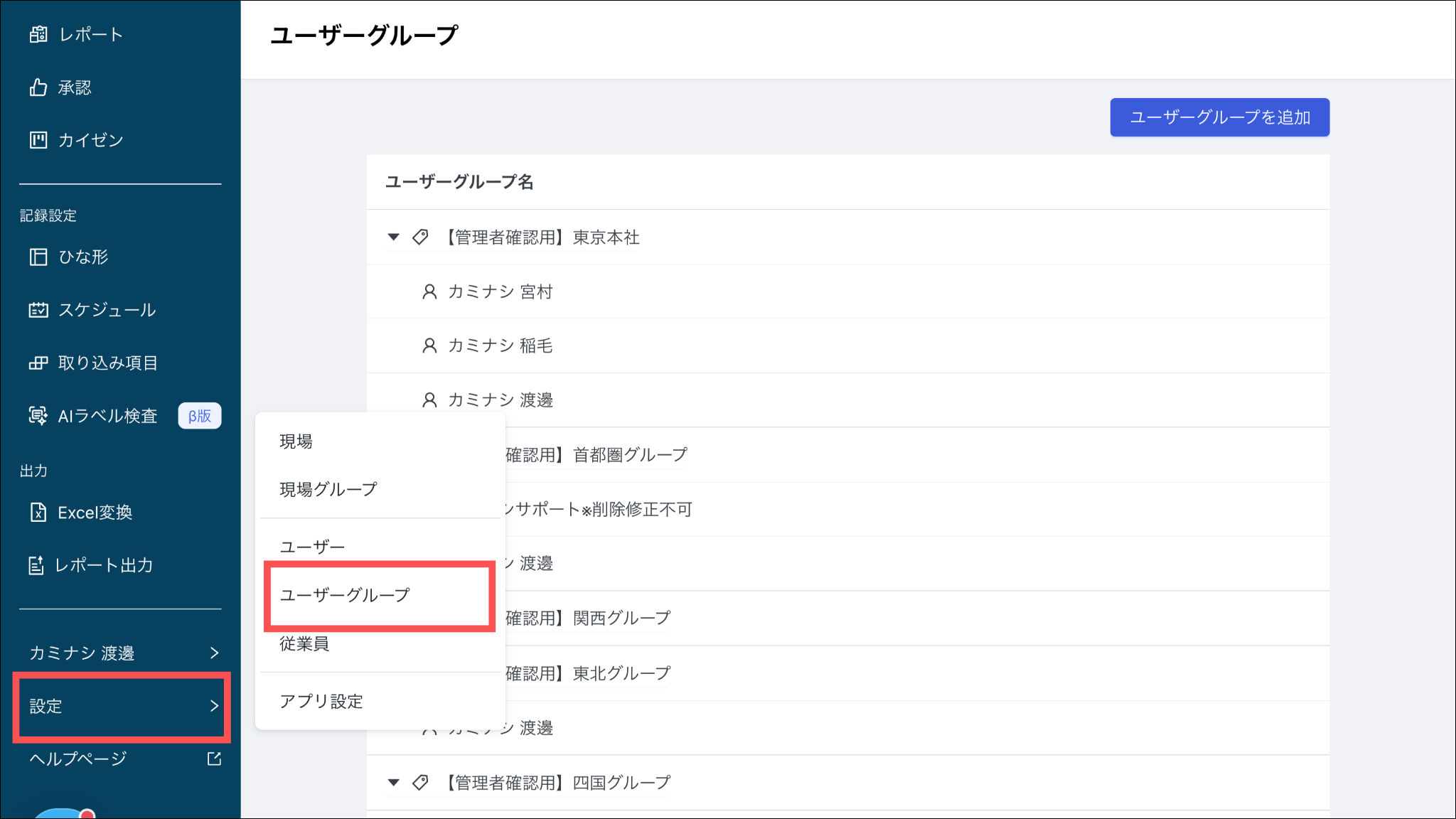 1. カミナシレポート 管理画面にログインする2.「設定」を選択し、「ユーザーグループ」を押す3. 「ユーザーグループを追加」を押す 4.「ユーザーグループ名」を入力して、「所属させるユーザー」を選択し、「保存」を押すよくある質問は、こちらからご確認ください。