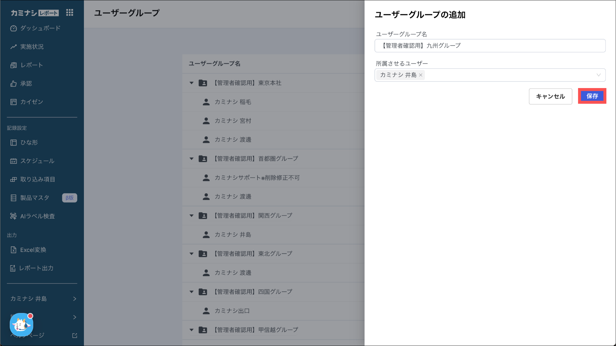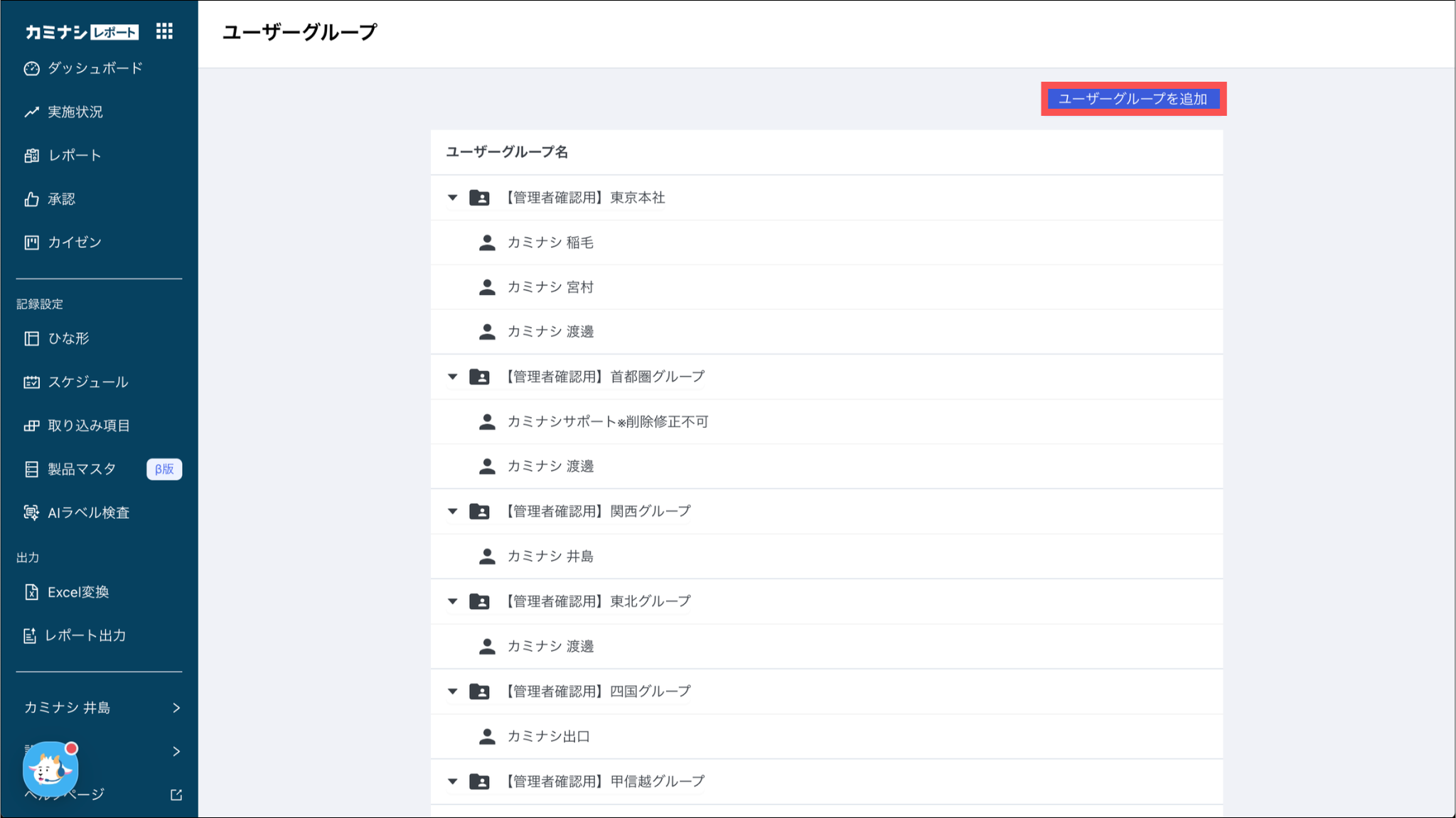 1. カミナシレポート 管理画面にログインする2.「設定」を押し、「ユーザーグループ」を選択する3. 「ユーザーグループを追加」を押す 4.ユーザーグループ名と所属させるユーザーを設定し、「保存」を押すよくある質問は、こちらからご確認ください。