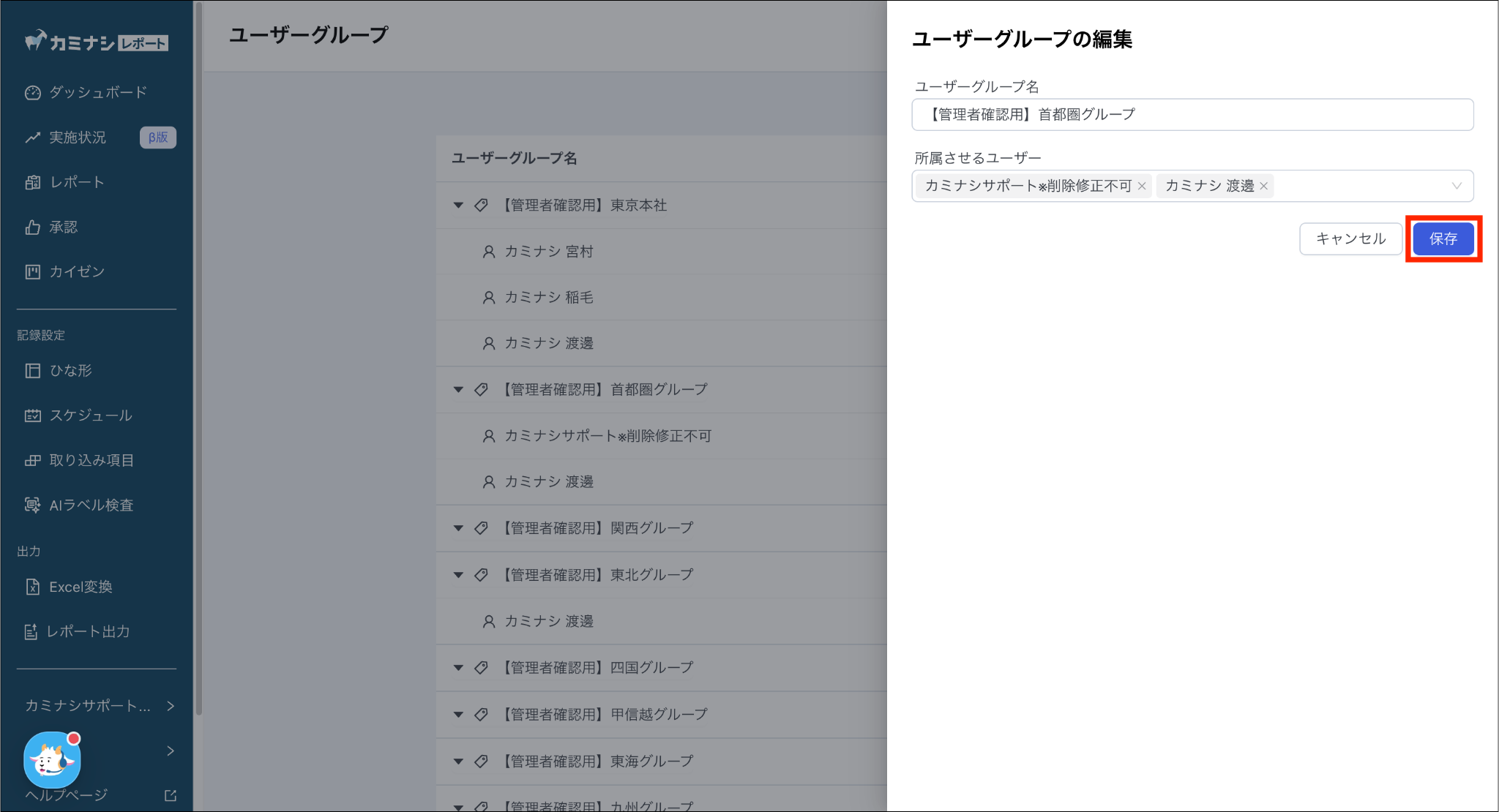 1. カミナシレポート 管理画面にログインする2. 「設定」を選択し、「ユーザーグループ」を押す3. 削除したいユーザーグループの「削除」を押す4. 再度確認し、「削除」を押す一度削除されたユーザーグループは復元できませんのでご注意ください。よくある質問は、こちらからご確認ください。