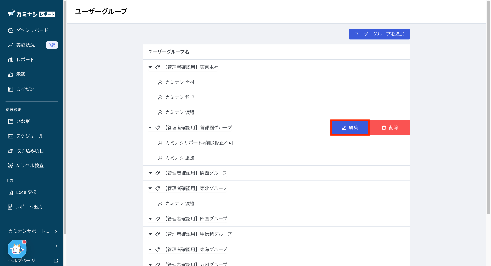 1. カミナシレポート 管理画面にログインする2. 「設定」を選択し、「ユーザーグループ」を押す3. 編集したいユーザーグループの「編集」を押す4. 「ユーザーグループ名」、「所属させるユーザー」を編集し、「保存」を押すよくある質問は、こちらからご確認ください。