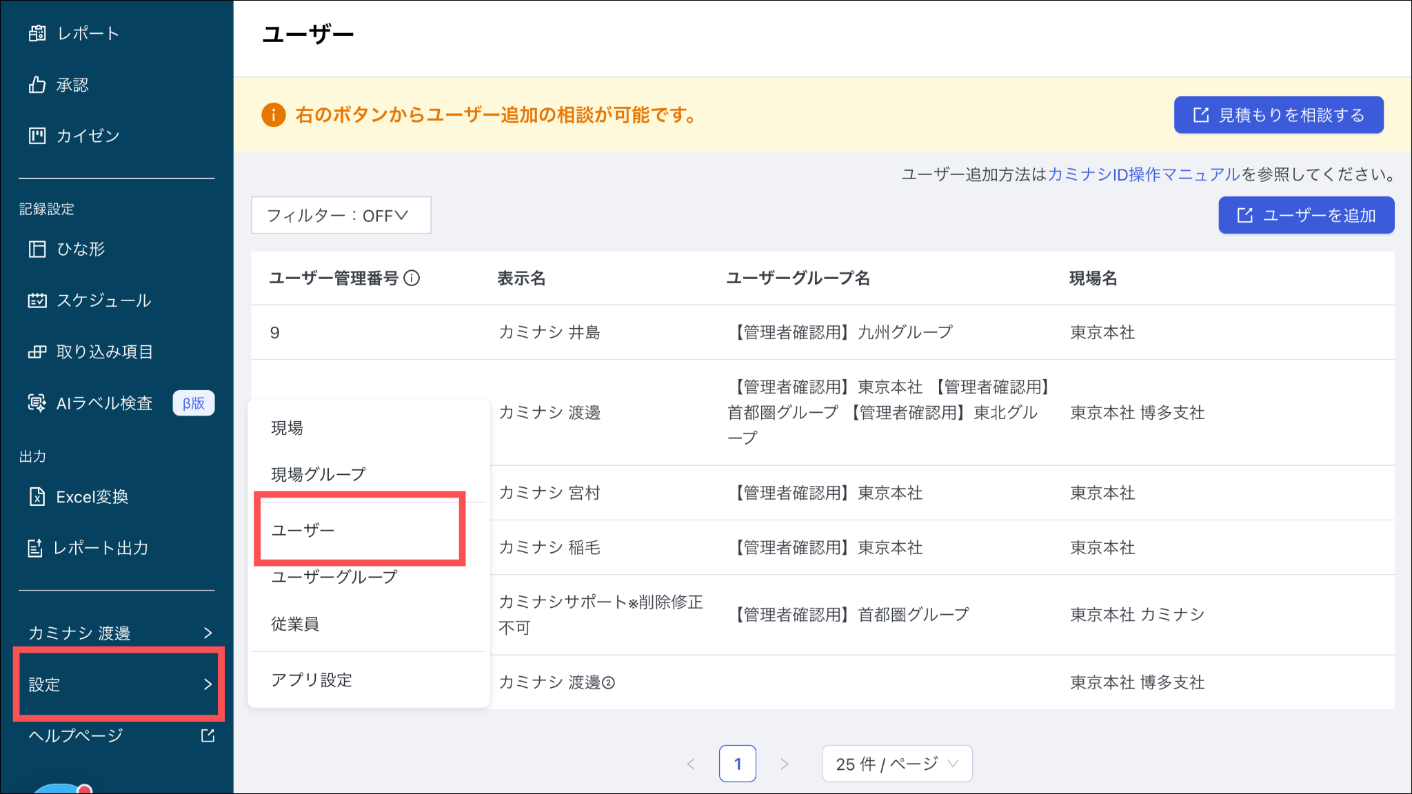 ユーザーの削除は「ユーザーを個別に削除する」をご参照ください。
