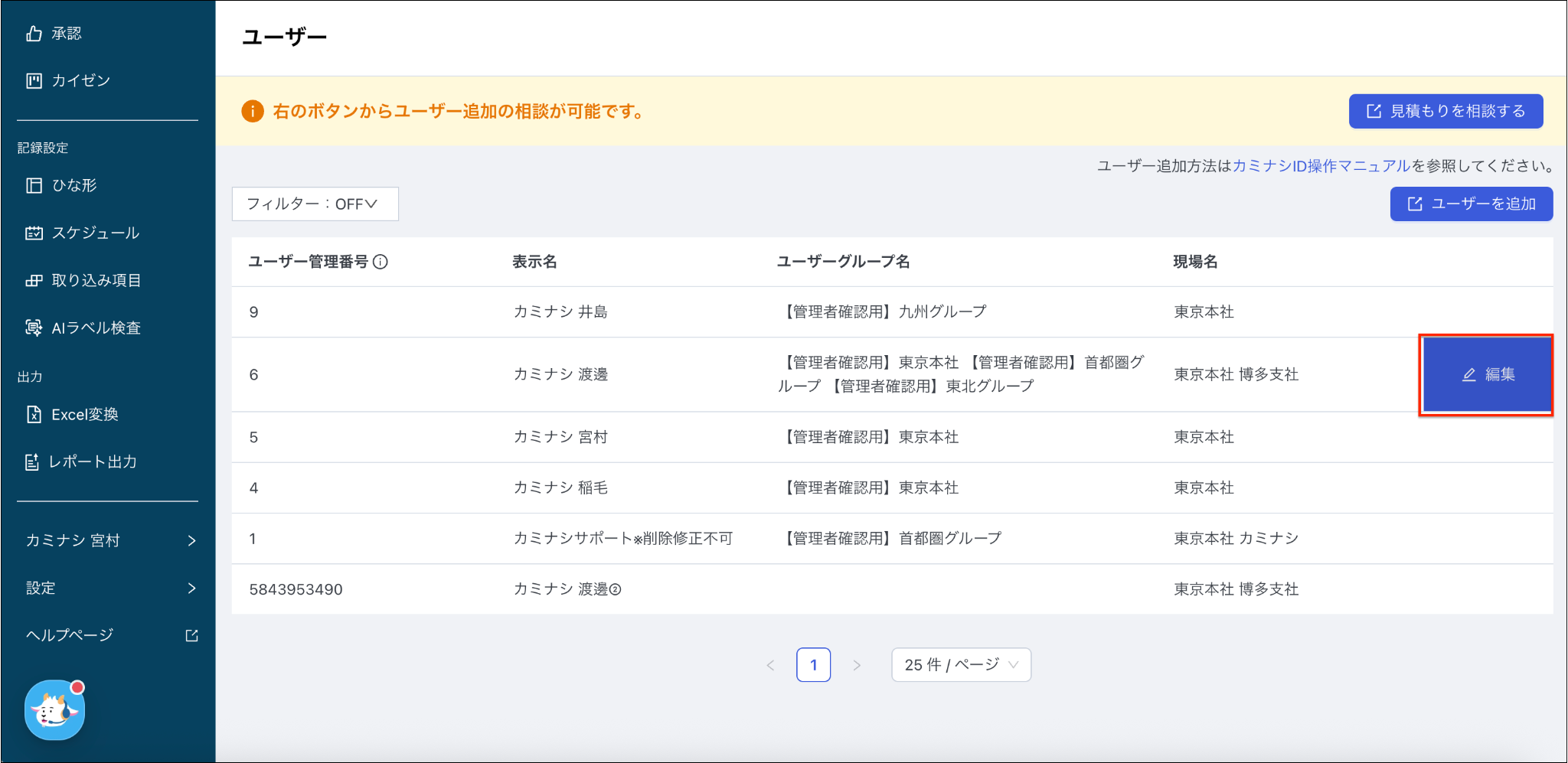 ユーザーの編集は「ユーザーを個別に編集する」をご参照ください。