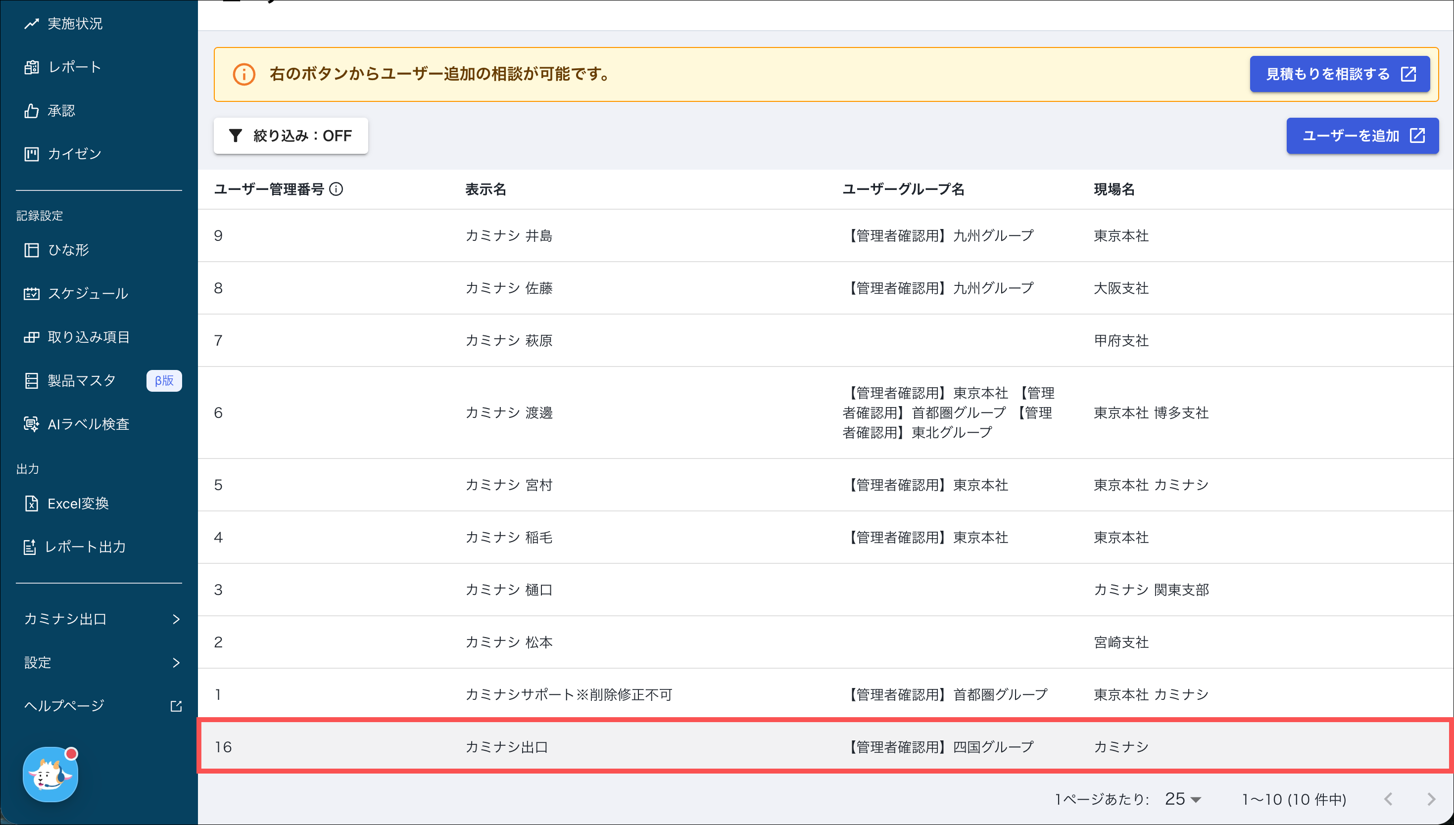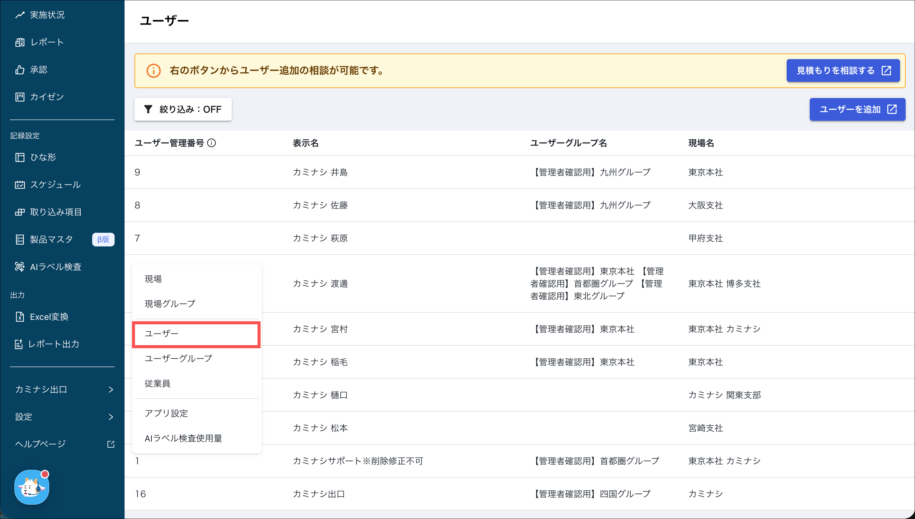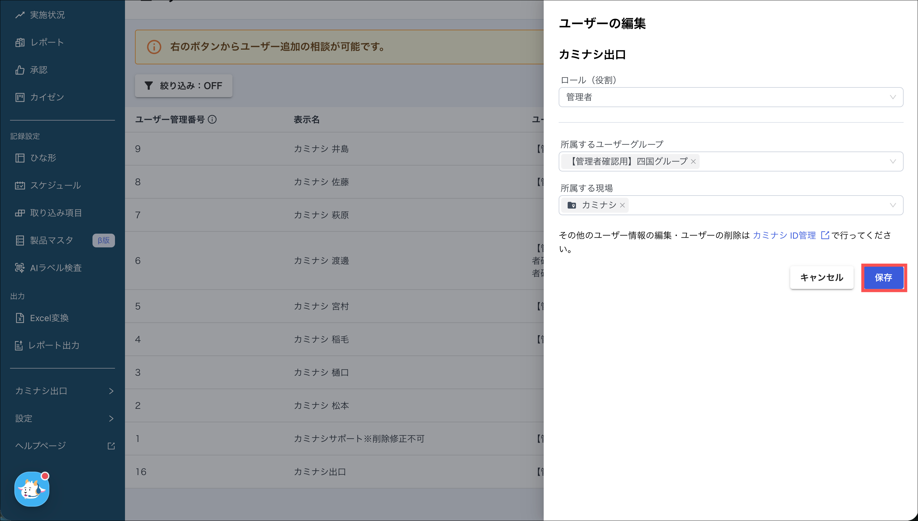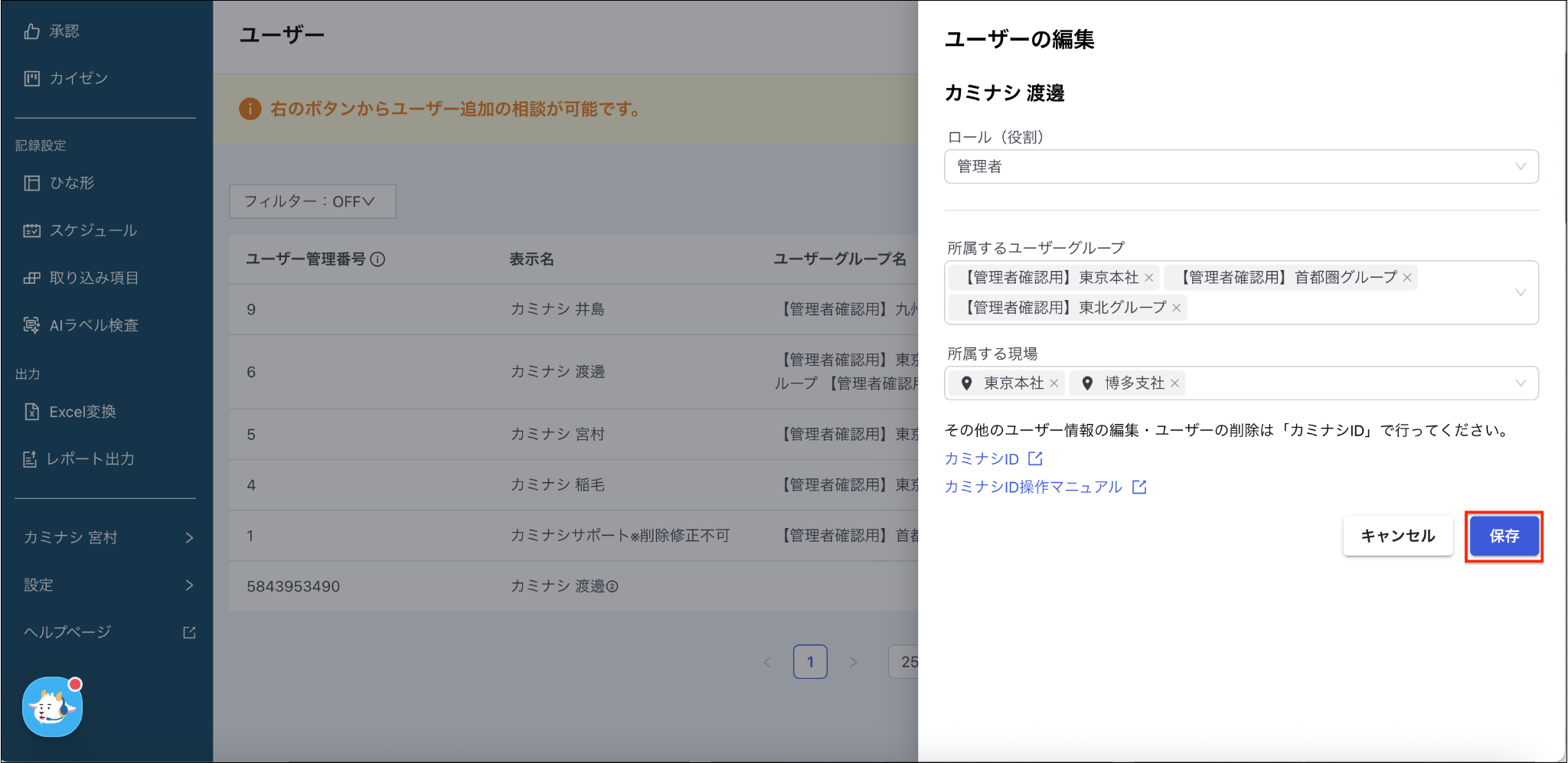 その他のユーザー情報(ユーザー管理番号・表示名・メールアドレス)の編集やユーザー削除はカミナシID管理で行う必要があります。