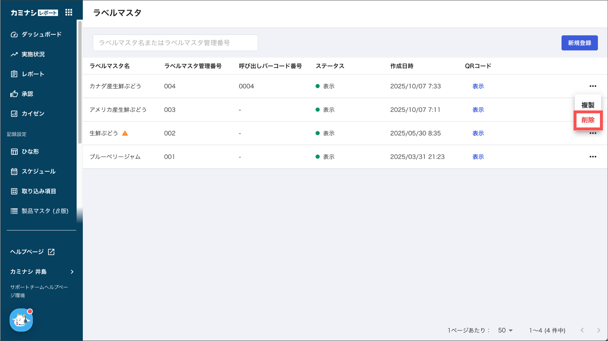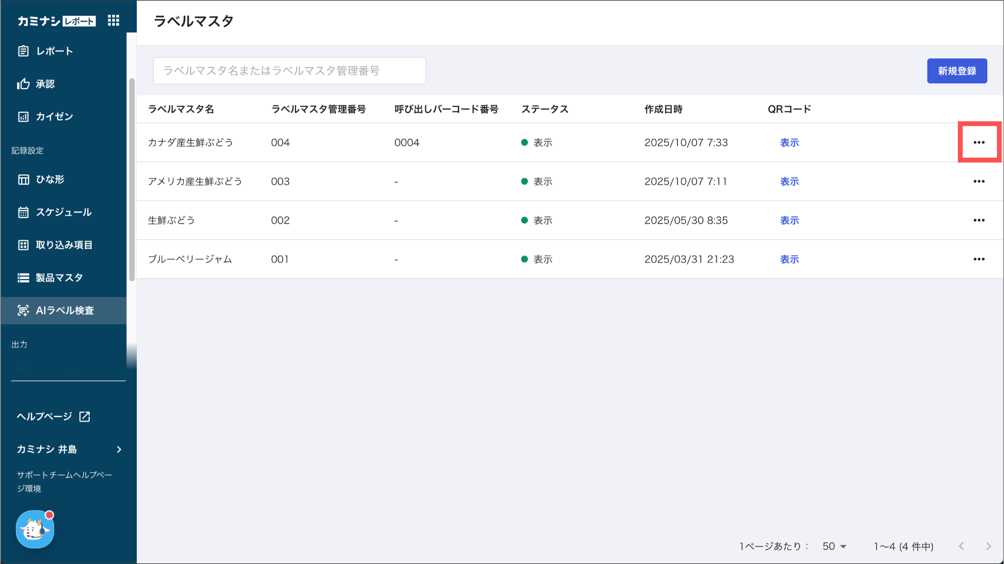 1.カミナシレポート 管理画面にログインする2.「AIラベル検査」を開き、削除するラベルマスタの「⋯」を押す3.「削除」を押す一度削除されたラベルマスタは復元できませんのでご注意ください。よくある質問は、こちらからご確認ください。