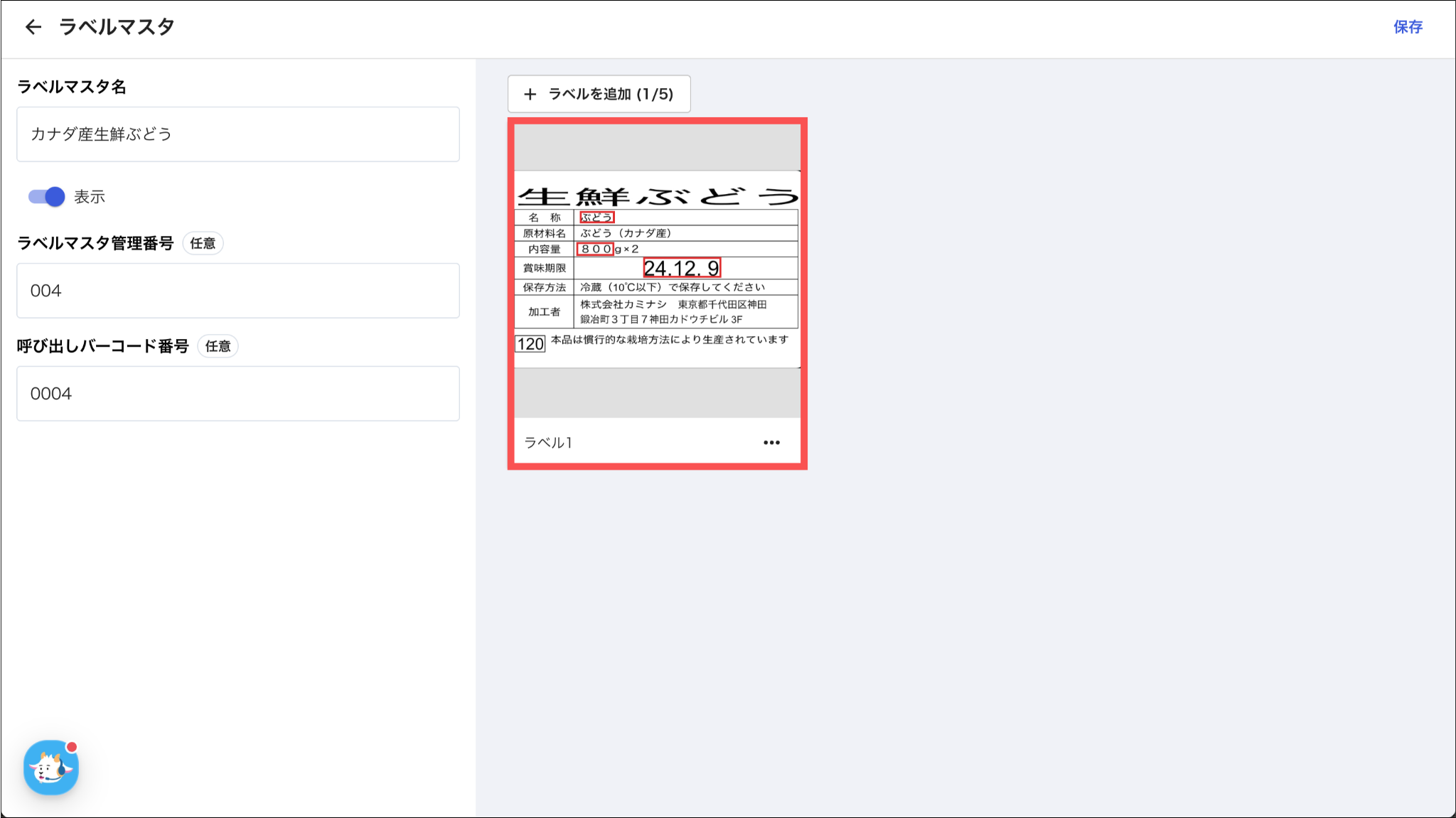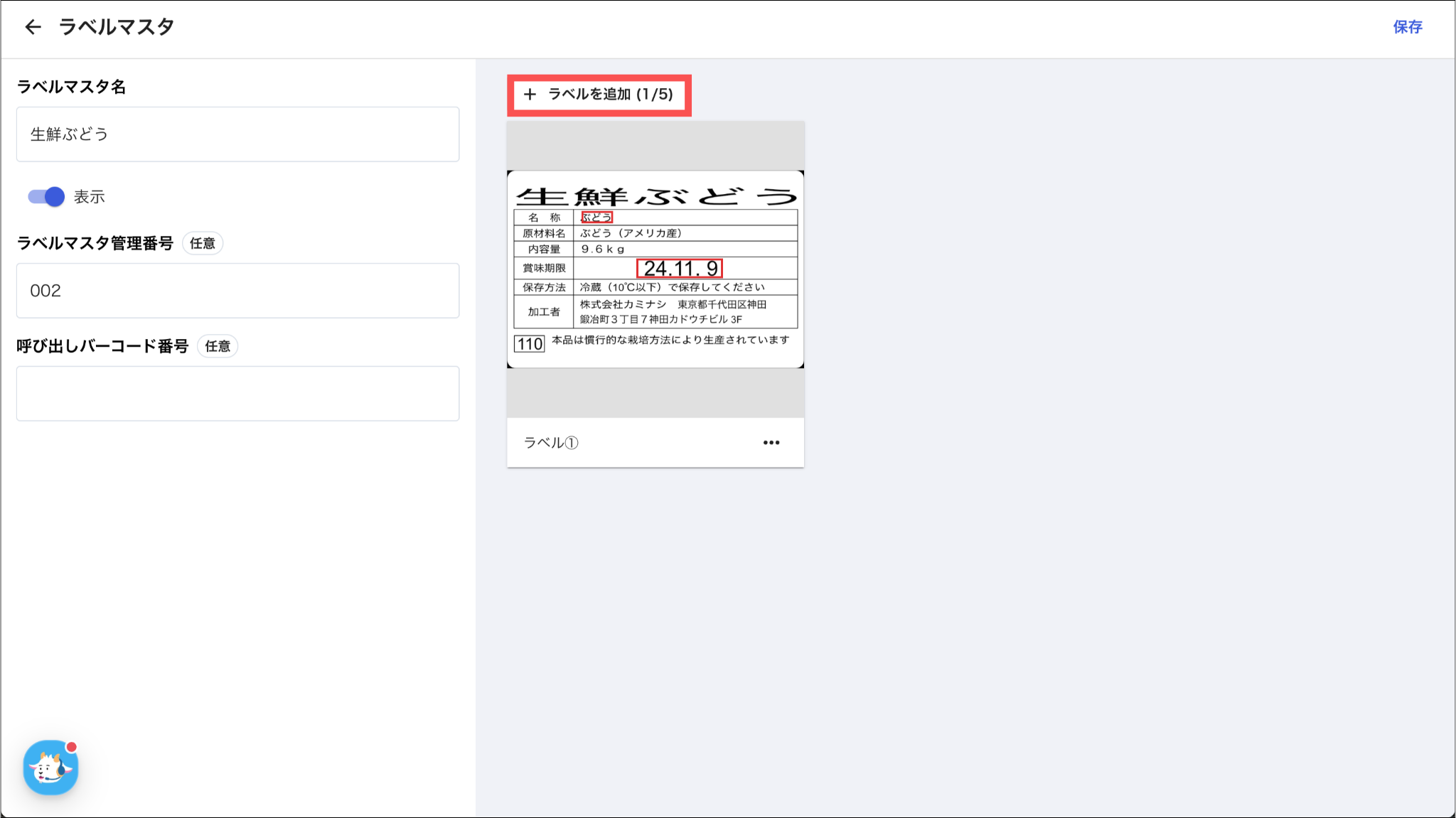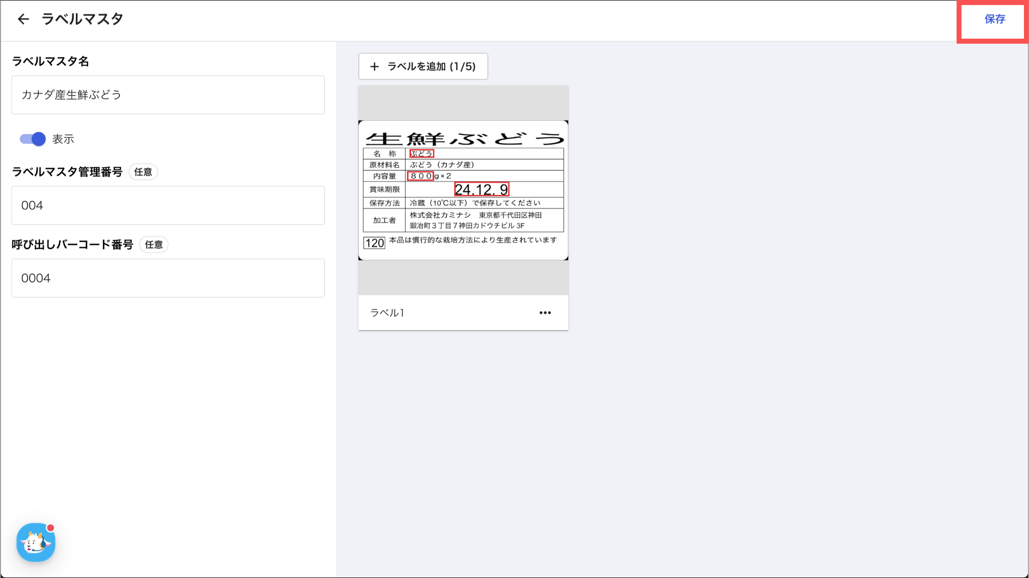 各項目については、「ラベルマスタを登録する:3.ラベル情報を入力し、「作成」を押す」をご参照ください。