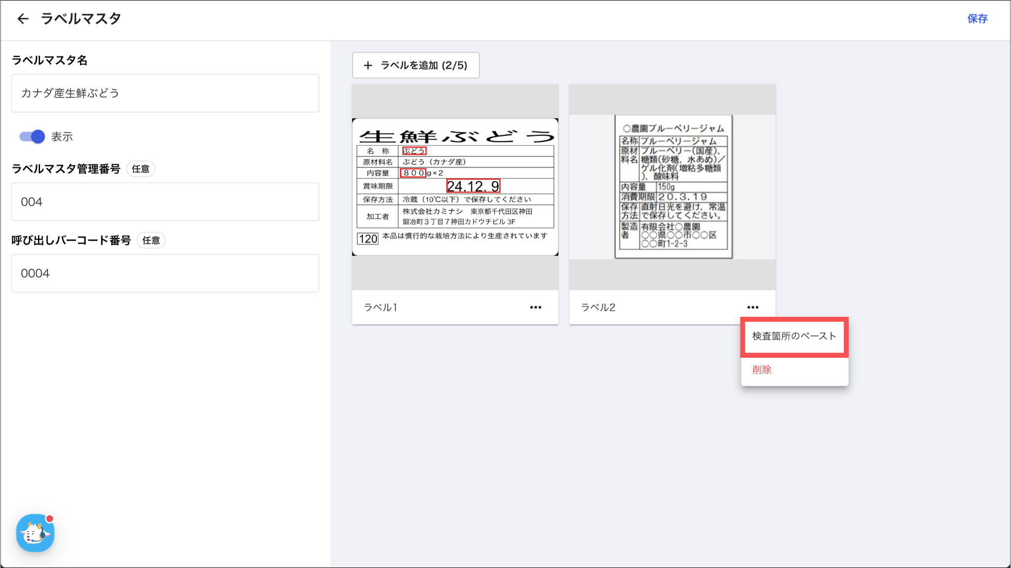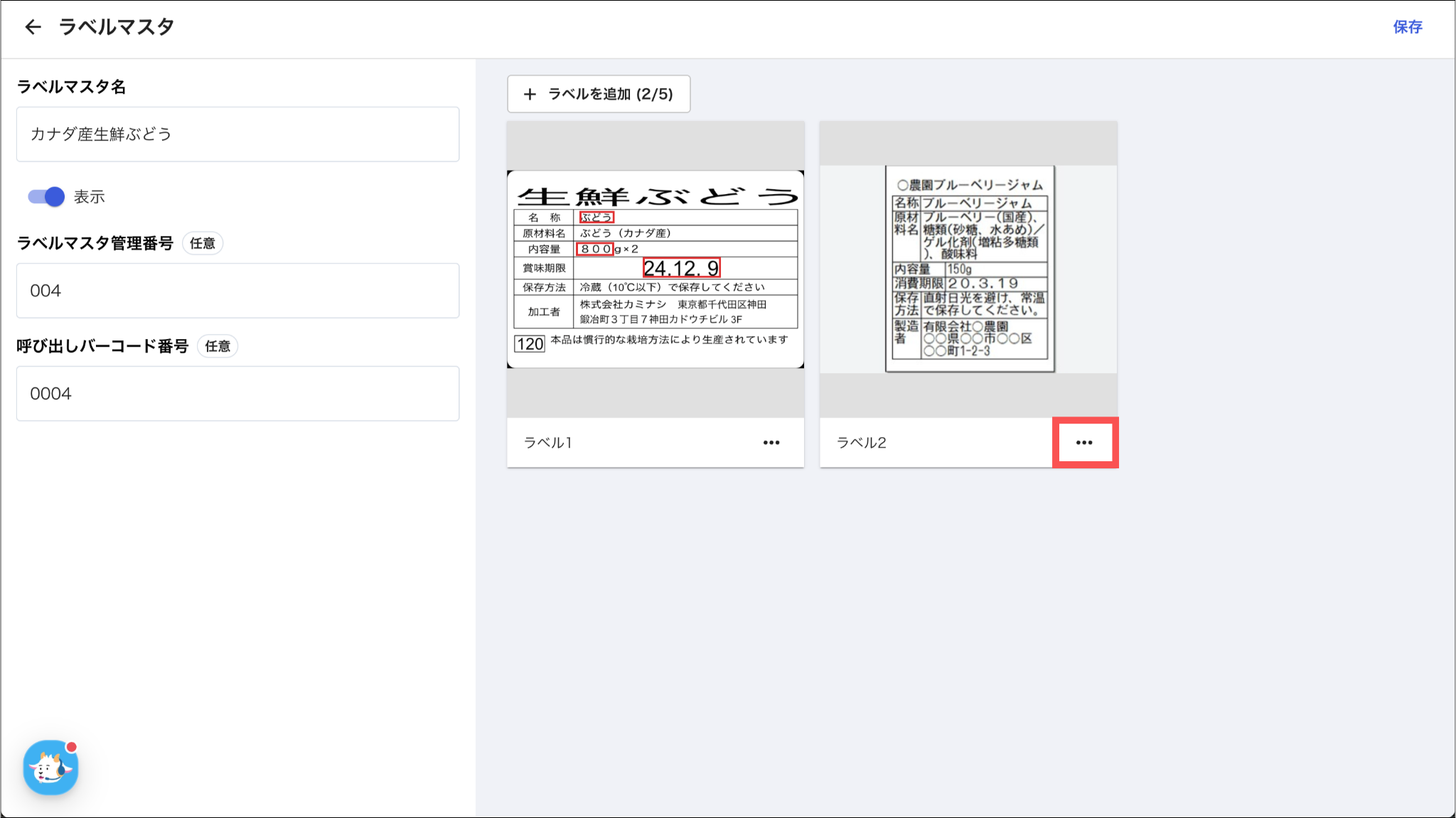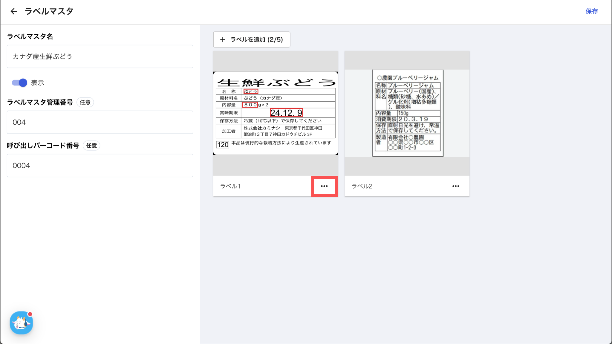 各項目については、「ラベルマスタを登録する:3.ラベル情報を入力し、「作成」を押す」をご参照ください。