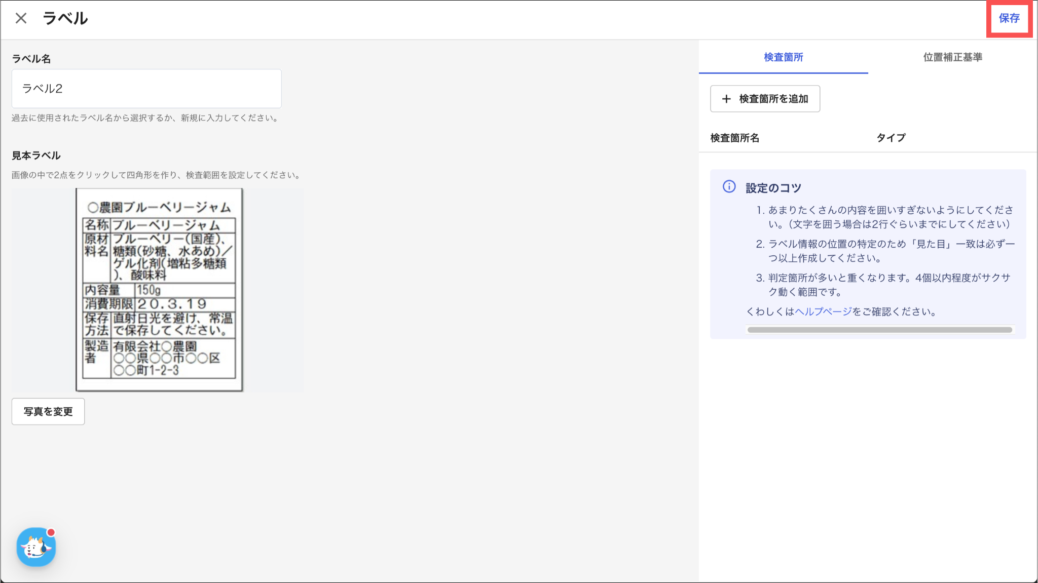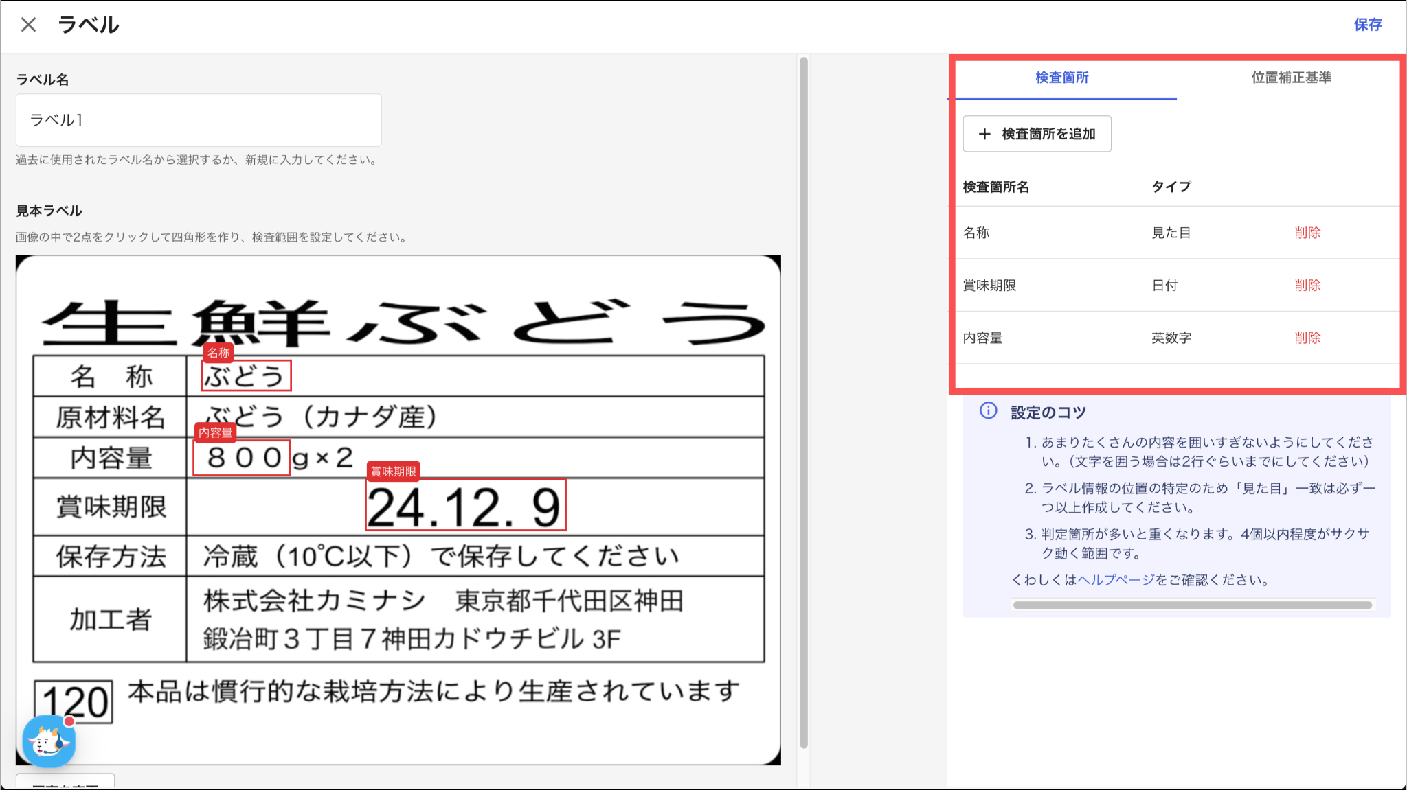 検査箇所については「ラベルマスタを登録する:9.一致タイプを選択する」、位置補正基準については「ラベルマスタを登録する:12.位置補正範囲を青枠で囲い、「確定」を押す」をご参照ください。