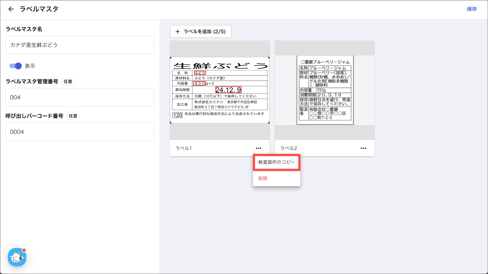 同一のラベルマスタ内や、他のラベルマスタにあるラベル見本に対して、設定済みの検査情報(検査箇所名、検査箇所の位置、日付や英数字の詳細設定など)を一括でコピーできます。