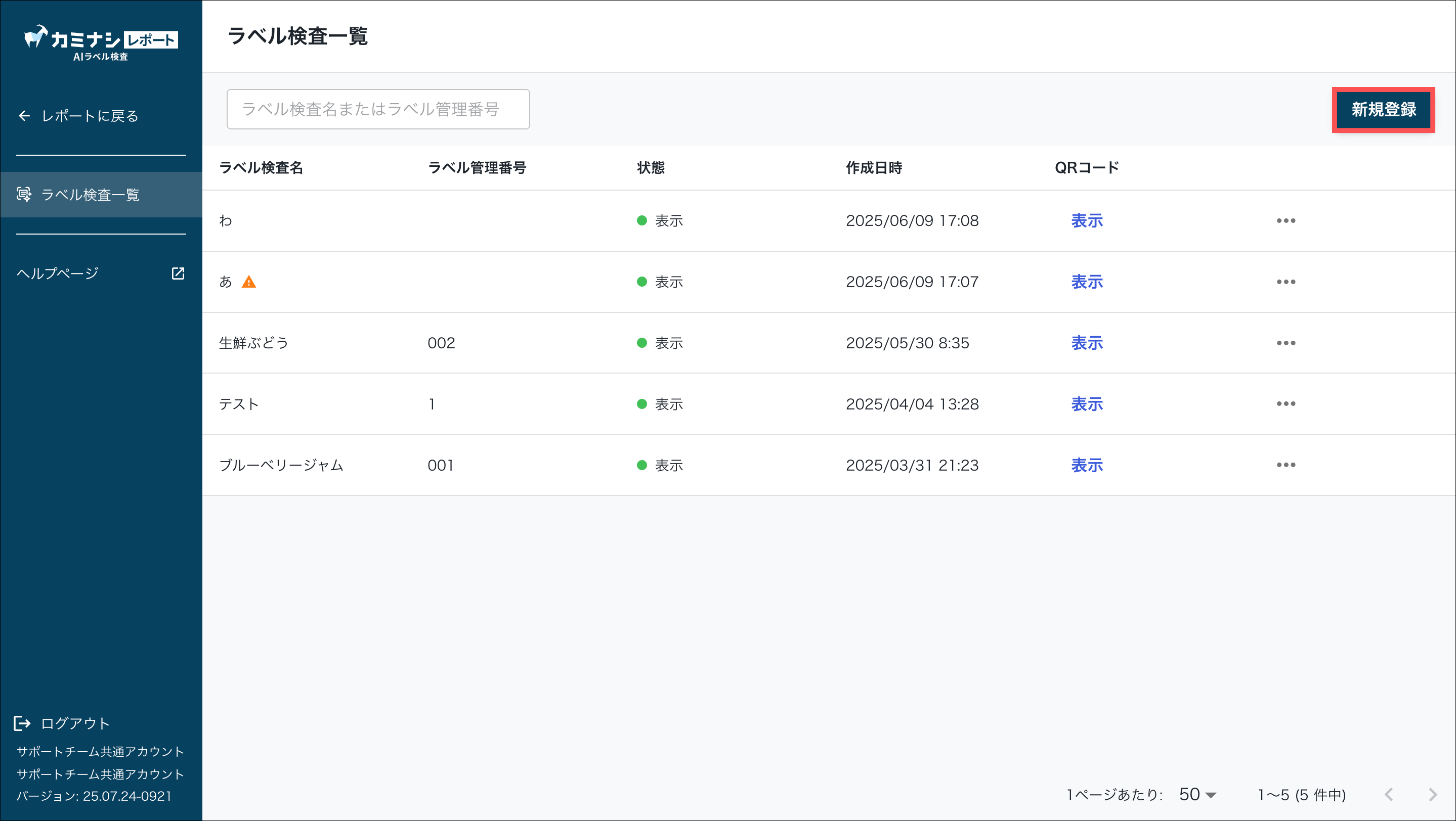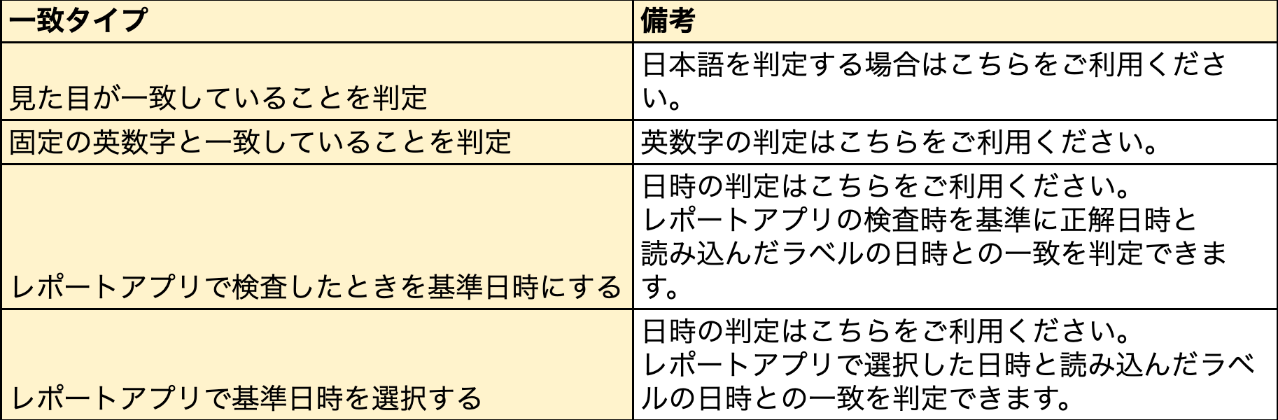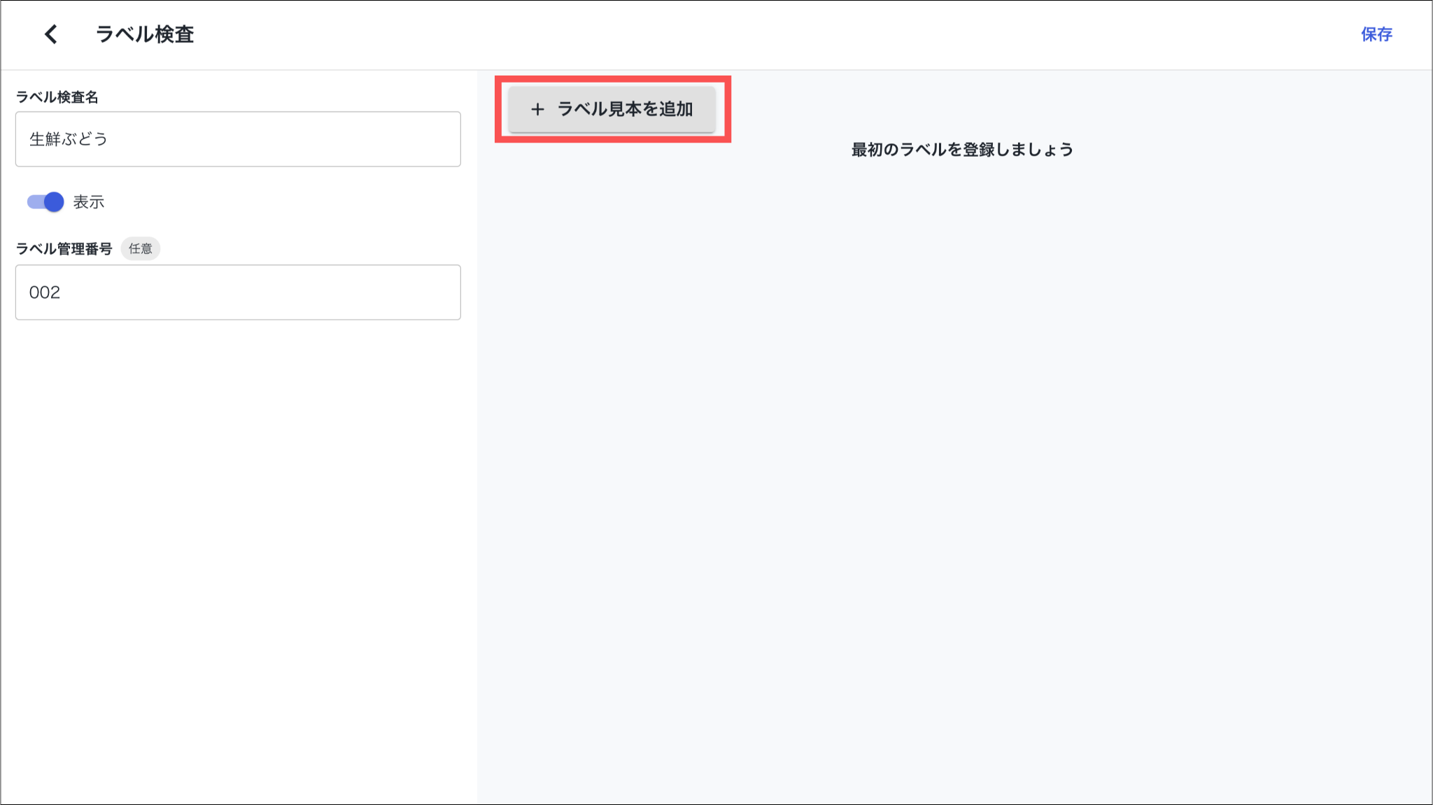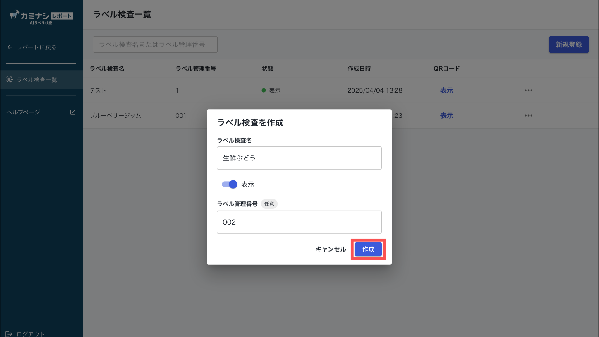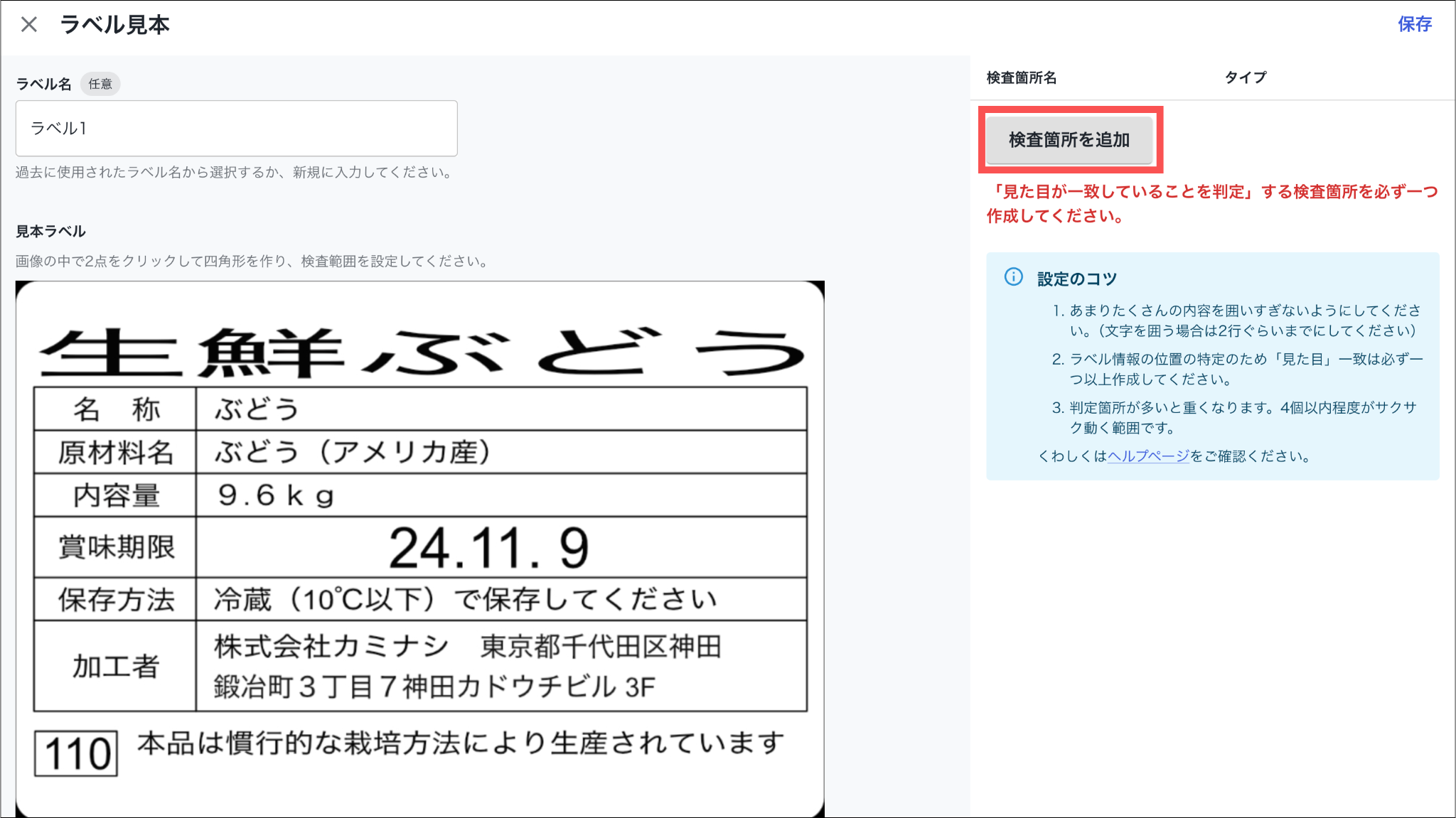 1.カミナシレポート 管理画面にログインする2.「AIラベル検査」を開き、「新規登録」を押す3.ラベル情報を入力し、「作成」を押す非表示にすると設定したラベルが記録画面で表示されません。 4.「+ラベル見本を追加」を押し、見本ラベルをアップロードする 5.「検査箇所を追加」を押す 6.アップロードしたラベル画像上でAIに判定させる箇所を指定する 7.「ラベル検査箇所名」を入力し、「一致タイプ」を選択する各一致タイプの詳細については以下の通りです。8.「保存」を押すよくある質問は、こちらからご確認ください。