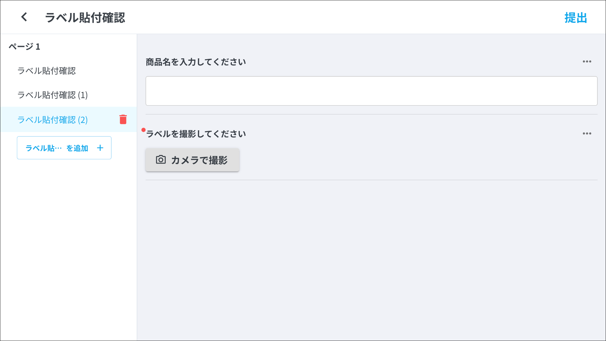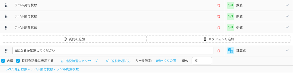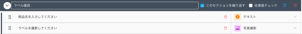 ラベル確認は、商品毎に必要になるため、日に何回、ラベルチェックをするか定まっていないケースが多いと思います。その場合は、セクション繰返し機能を活用すると良いでしょう。セクションの最初に、商品名を記入(商品がたくさんある場合はセット選択肢を活用)してから、具体的なチェック項目という構成にすればスムーズです。