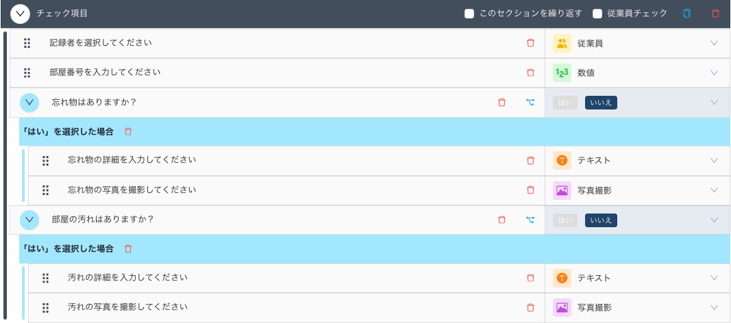 また、客室チェックは時間が限られている中で進めなければいけないため、記録を残さなければいけない異常時は「はい」もしくは「いいえ」で回答を固定しておくように質問を組み立てると良いでしょう。
