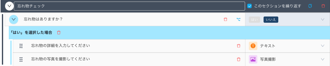 ただ、すべての部屋が毎日客室チェックが発生しているわけではないホテルがほとんどでしょう。その場合は、条件分岐を活用し、最初に実施の有無の質問を追加する運用をされることをおすすめいたします。