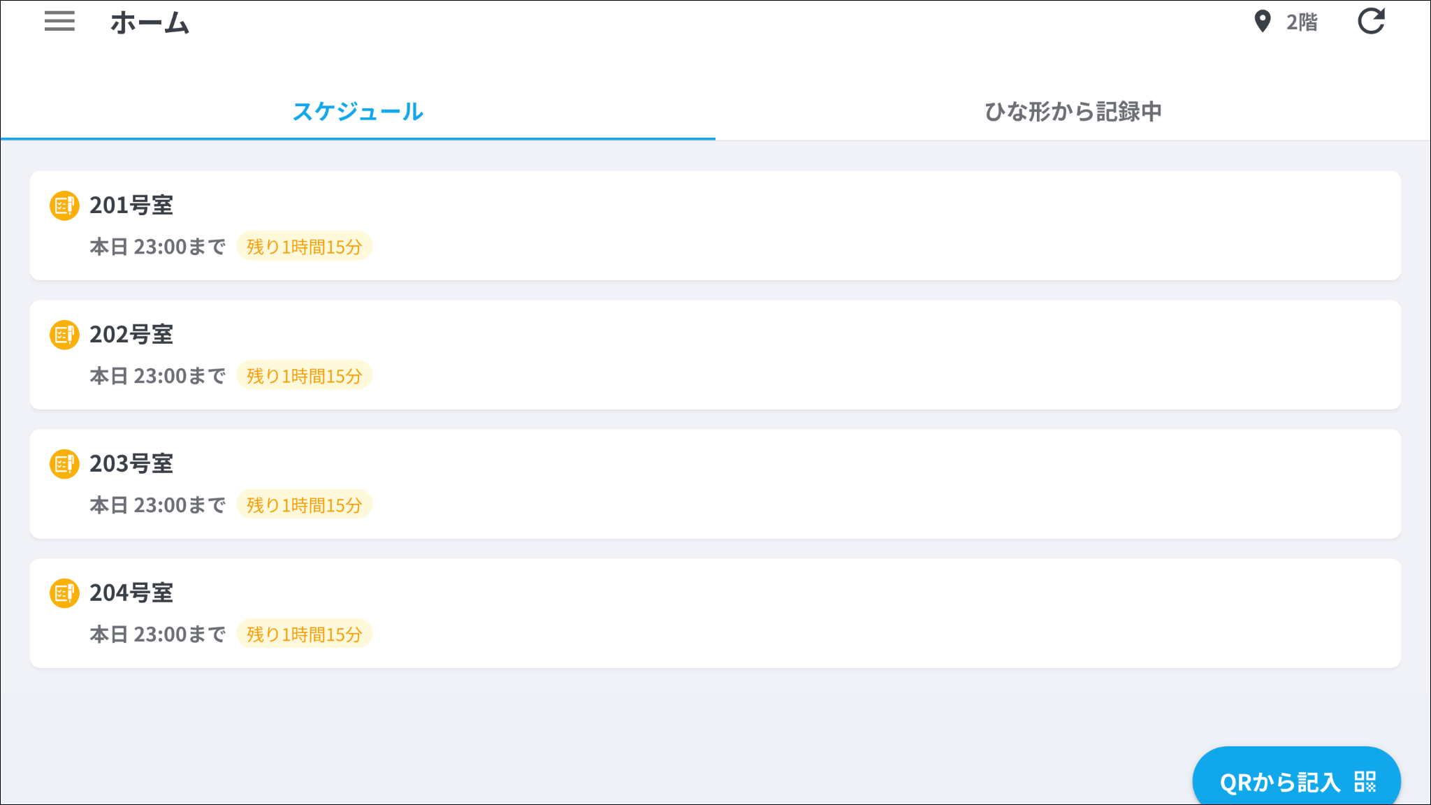 客室チェックは、スケジュールを活用し、運用方法に合わせた表示を行うことをおすすめします。例えば下記は、フロア毎に現場を作成し、各部屋毎にスケジュールを作成した場合です。このように設定を行うと、スケジュールを活用し、どの部屋が今終わっているのか、などの進捗も確認することが可能です。