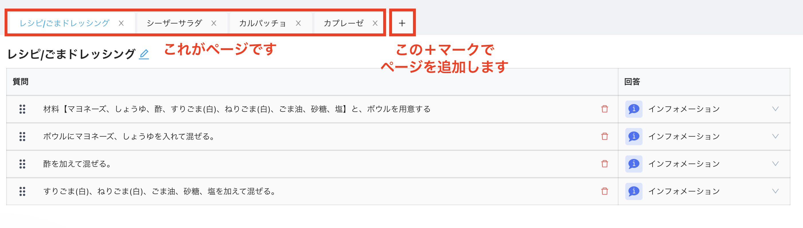 ひな形作成画面で、ページでいくつかのレシピを作成します。