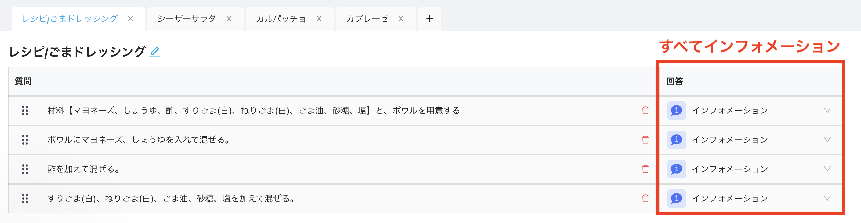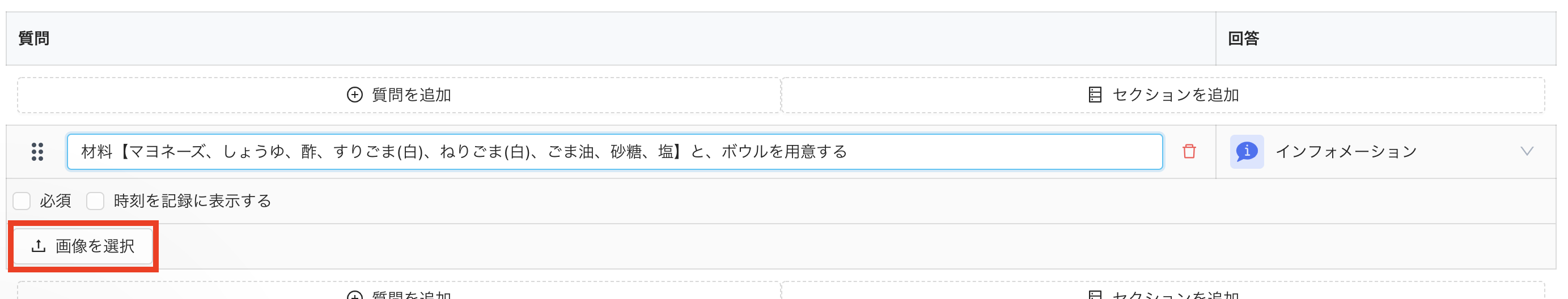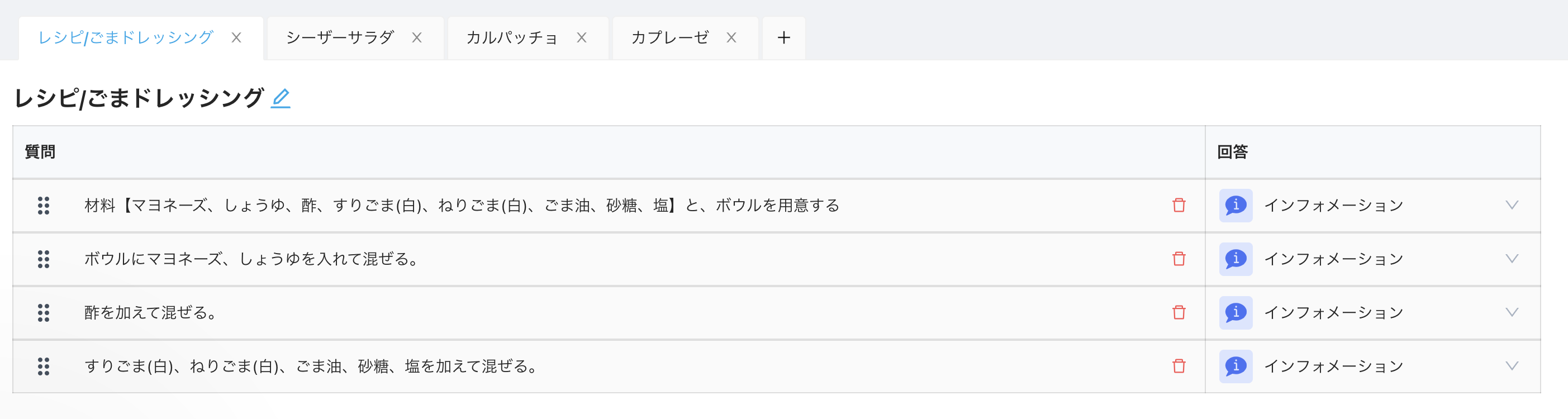 ひな形でレシピを作る際には、以下のように質問を調理ステップとし、工程を記載していきます。
