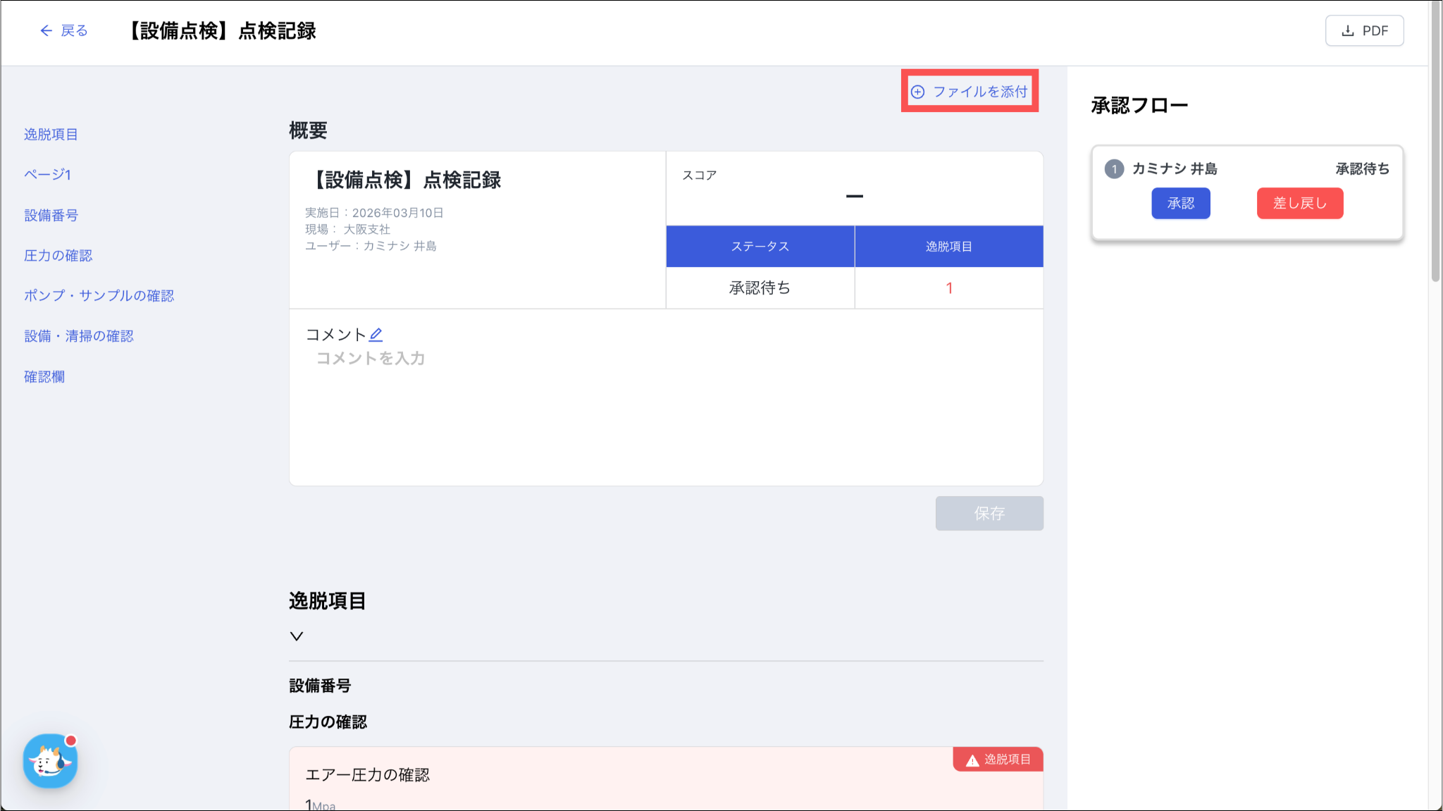 1. カミナシレポート 管理画面にログインする2.「レポート」を開き、添付するレポートを押す3.「ファイルを添付」を押し、資料を添付する管理画面でのみ添付と閲覧ができます。よくある質問は、こちらからご確認ください。
