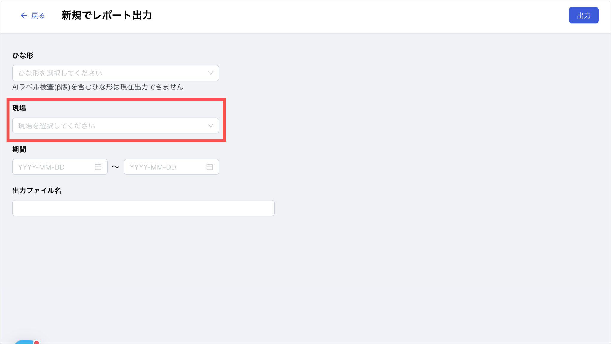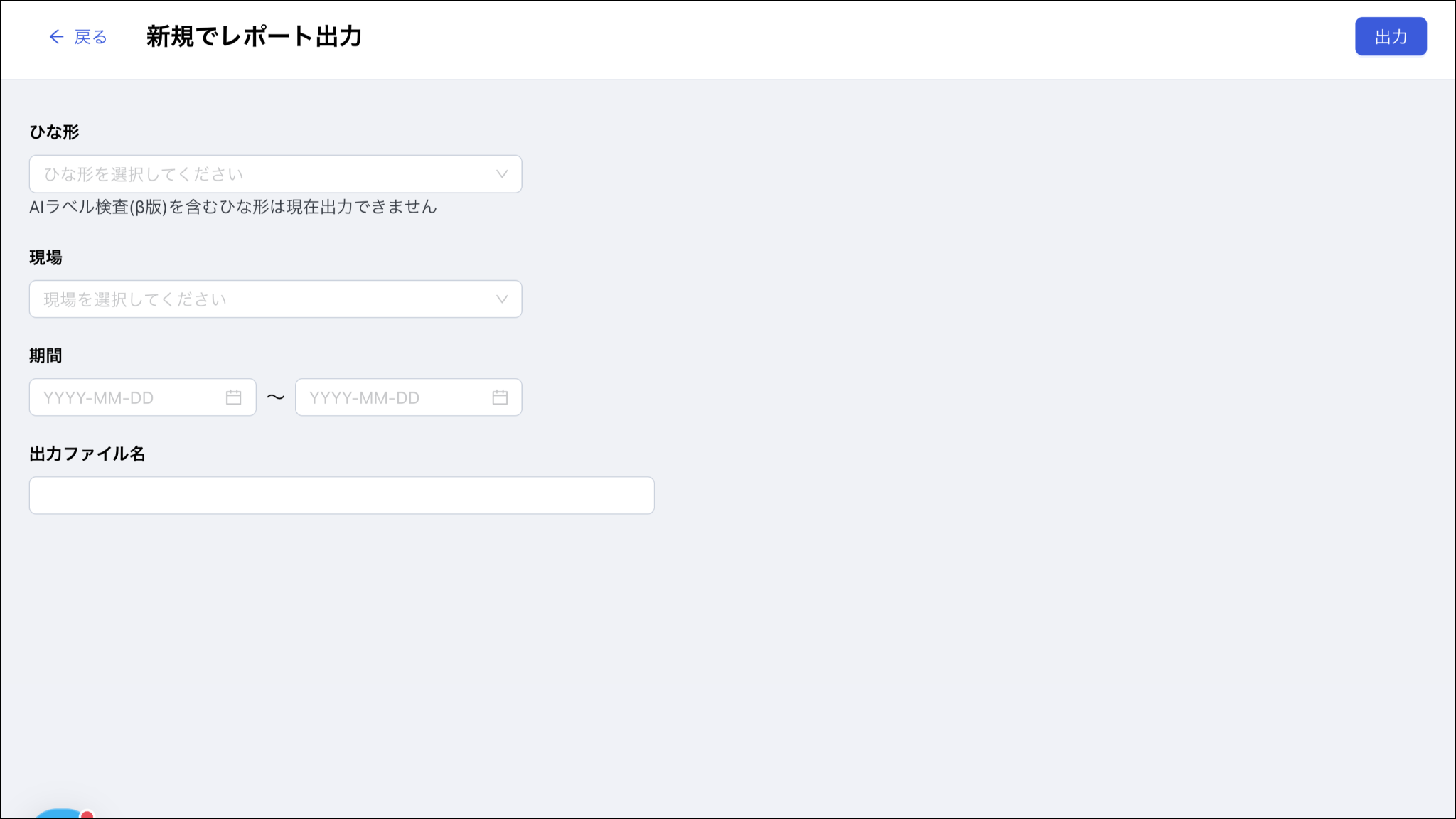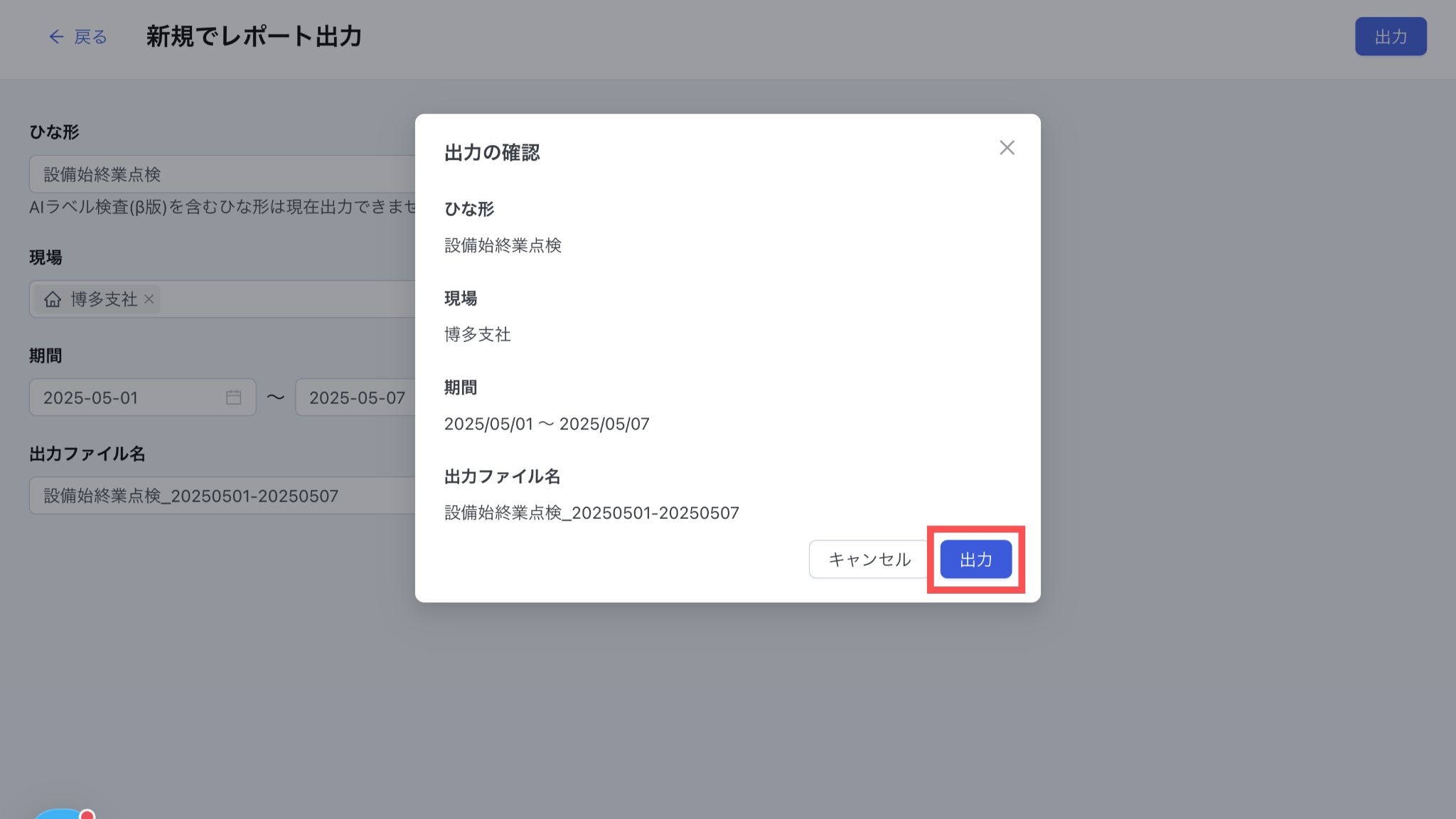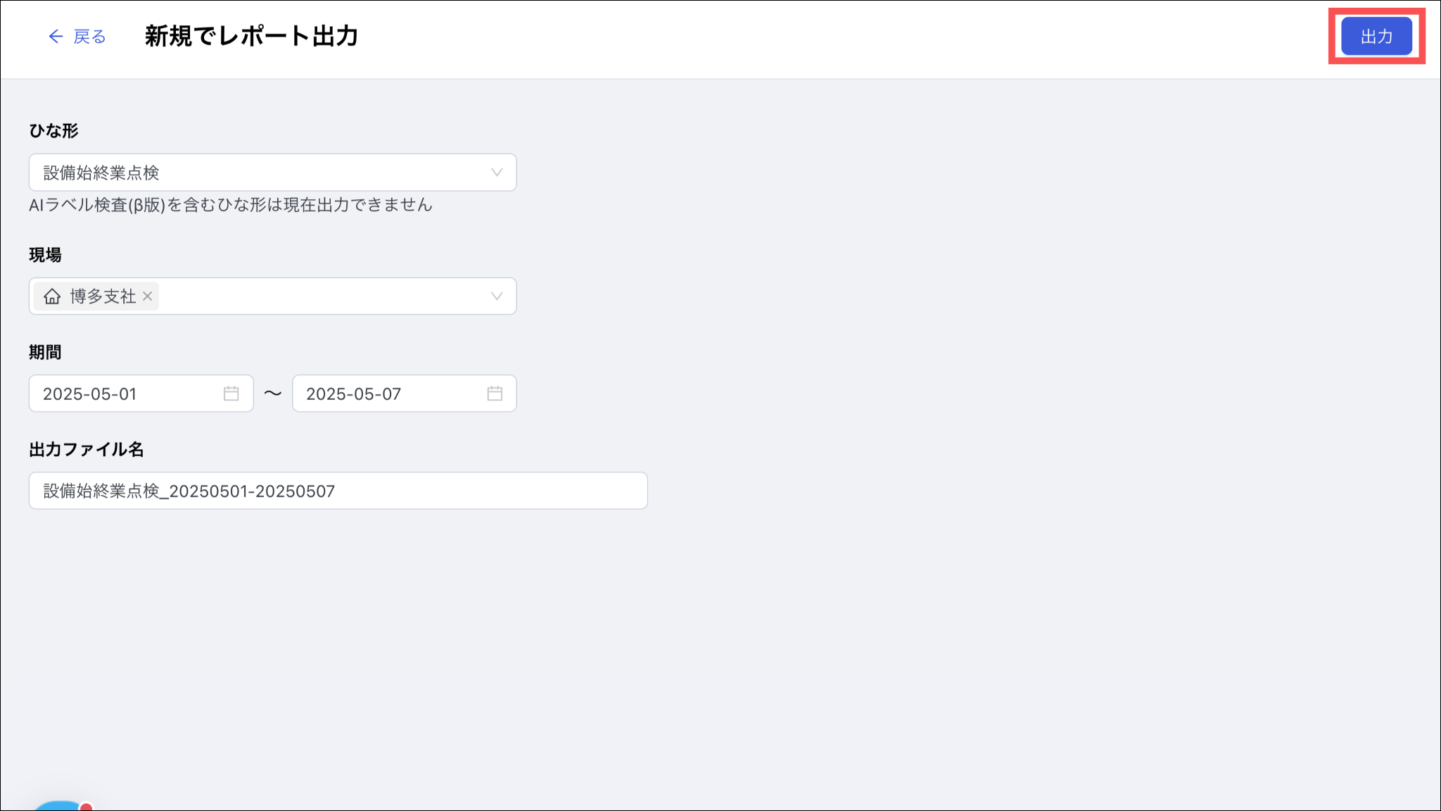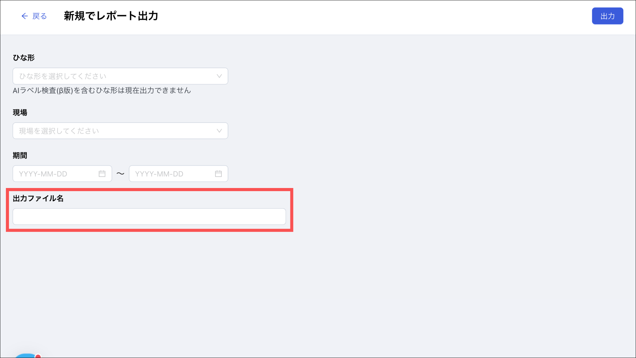 出力ファイル名を設定します。ひな形名・期間に合わせて自動でレコメンドされますが、編集することができます。