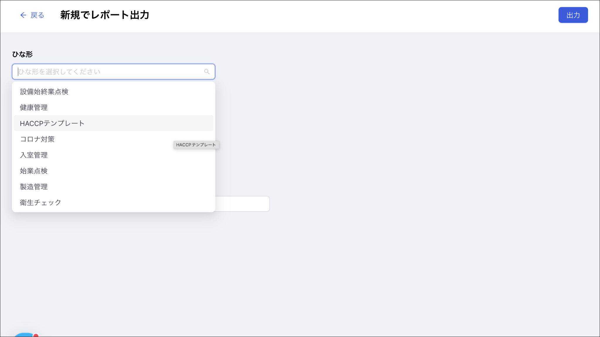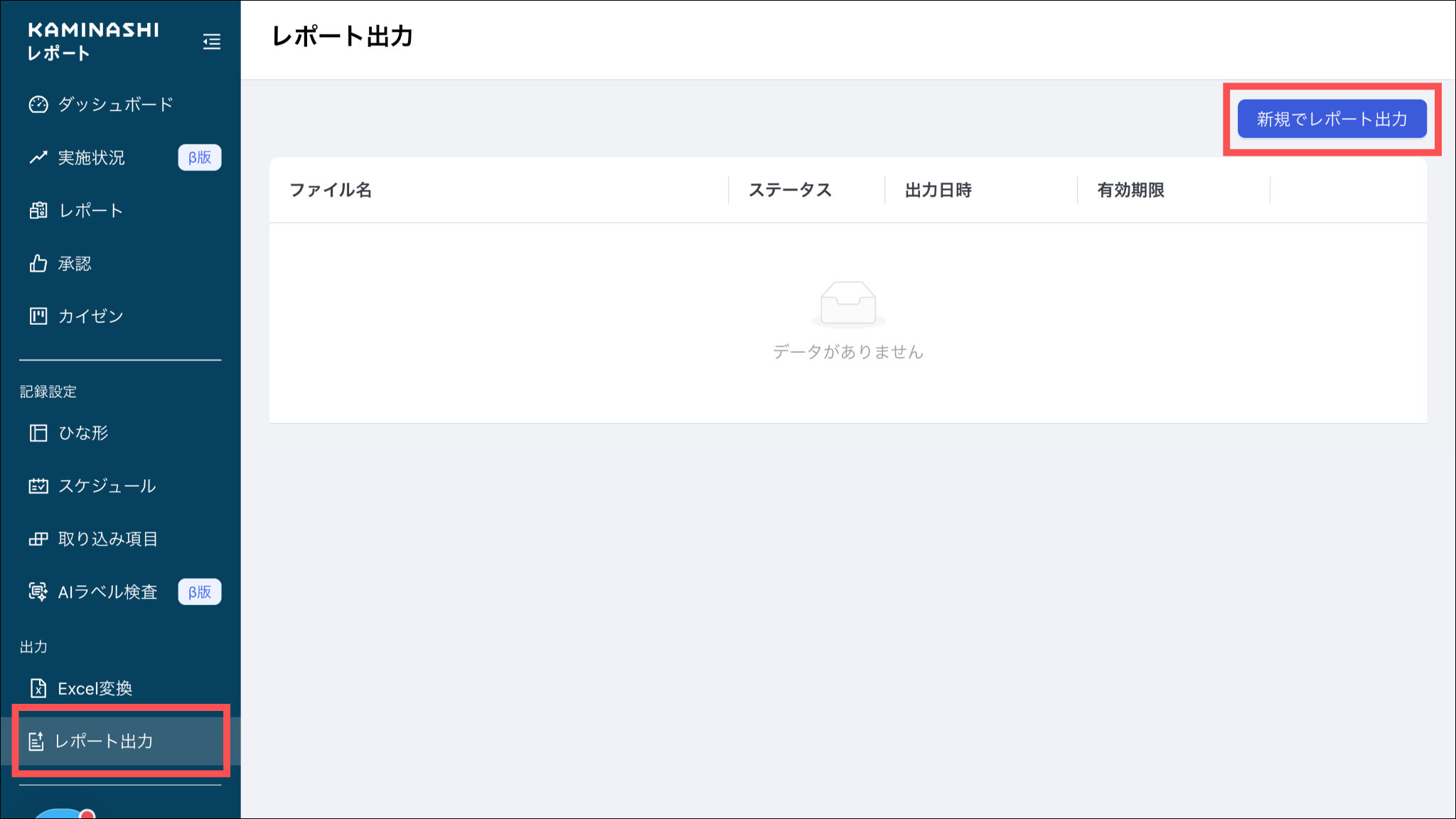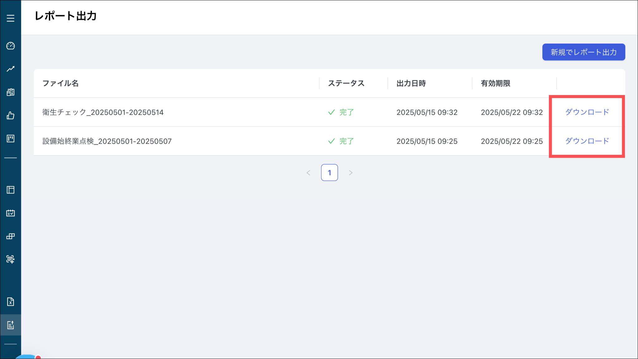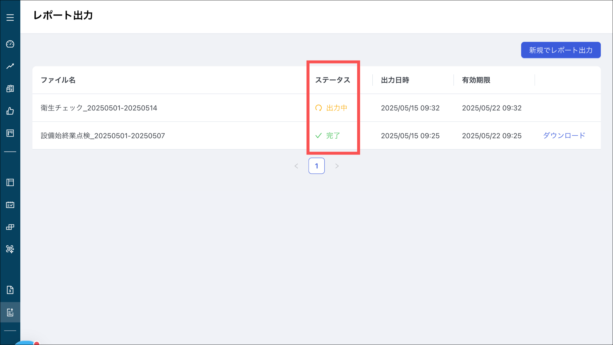 ※時間が経過してもステータスが「完了」とならない場合、ブラウザを更新するか、別のメニューを押してから、再度「レポート出力」を押してください