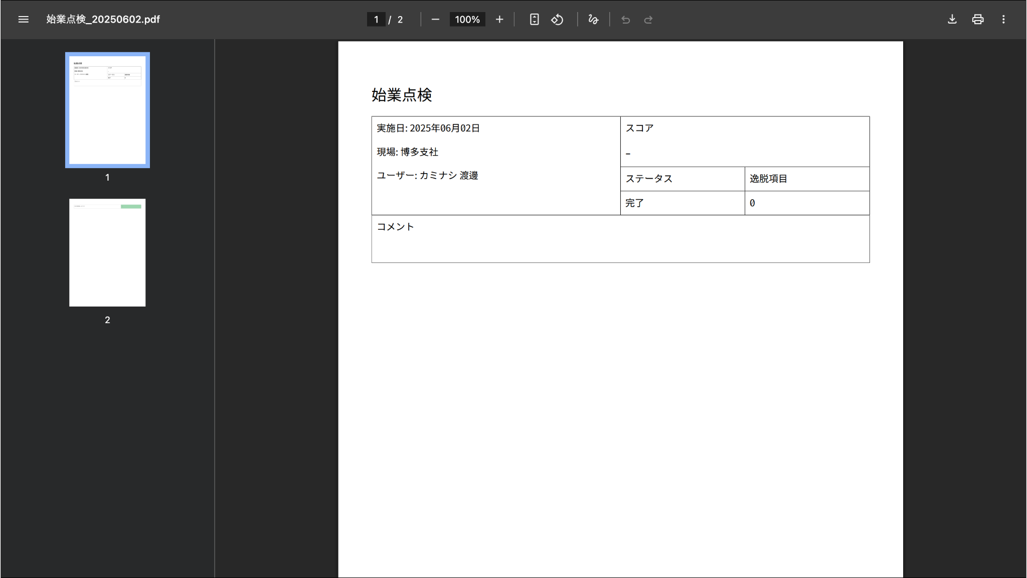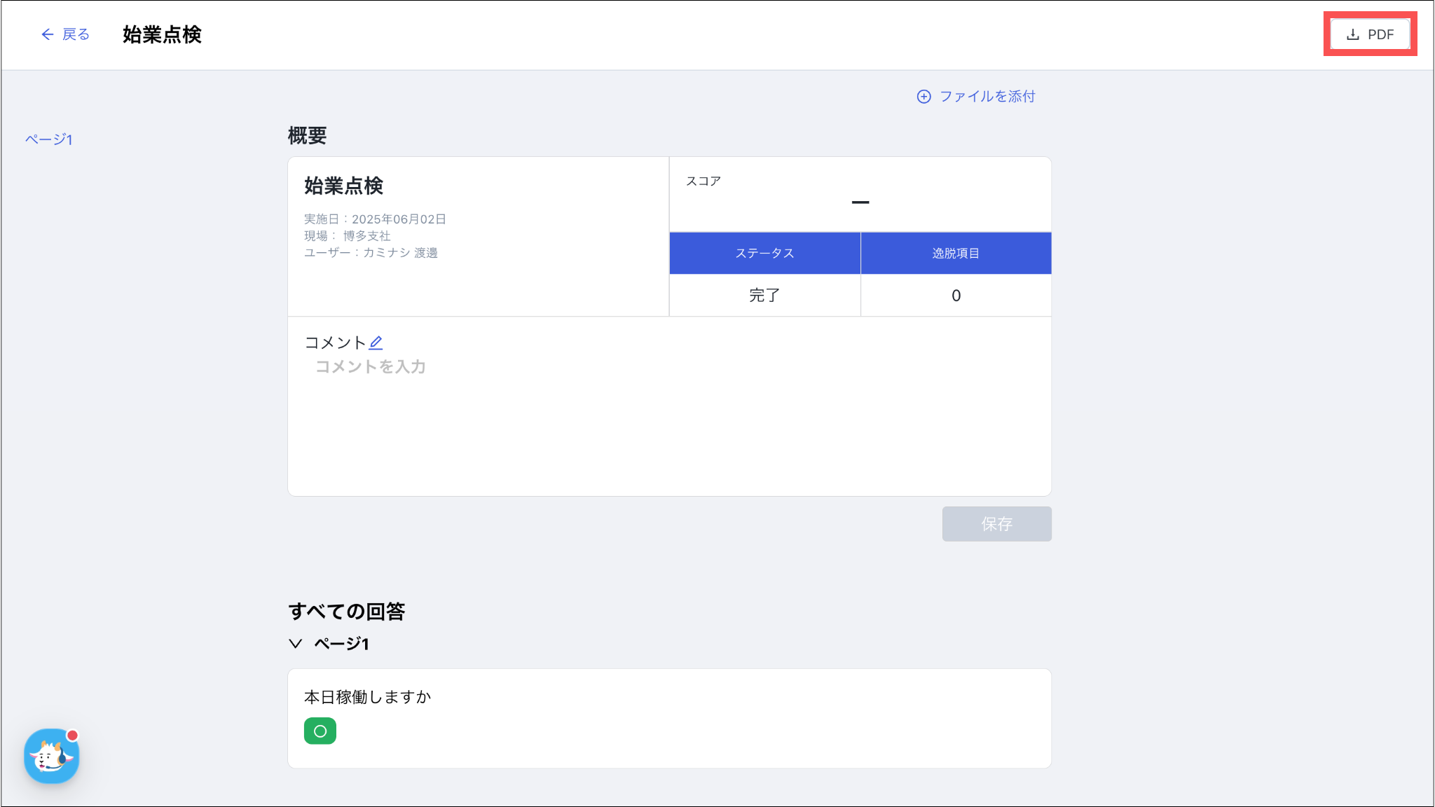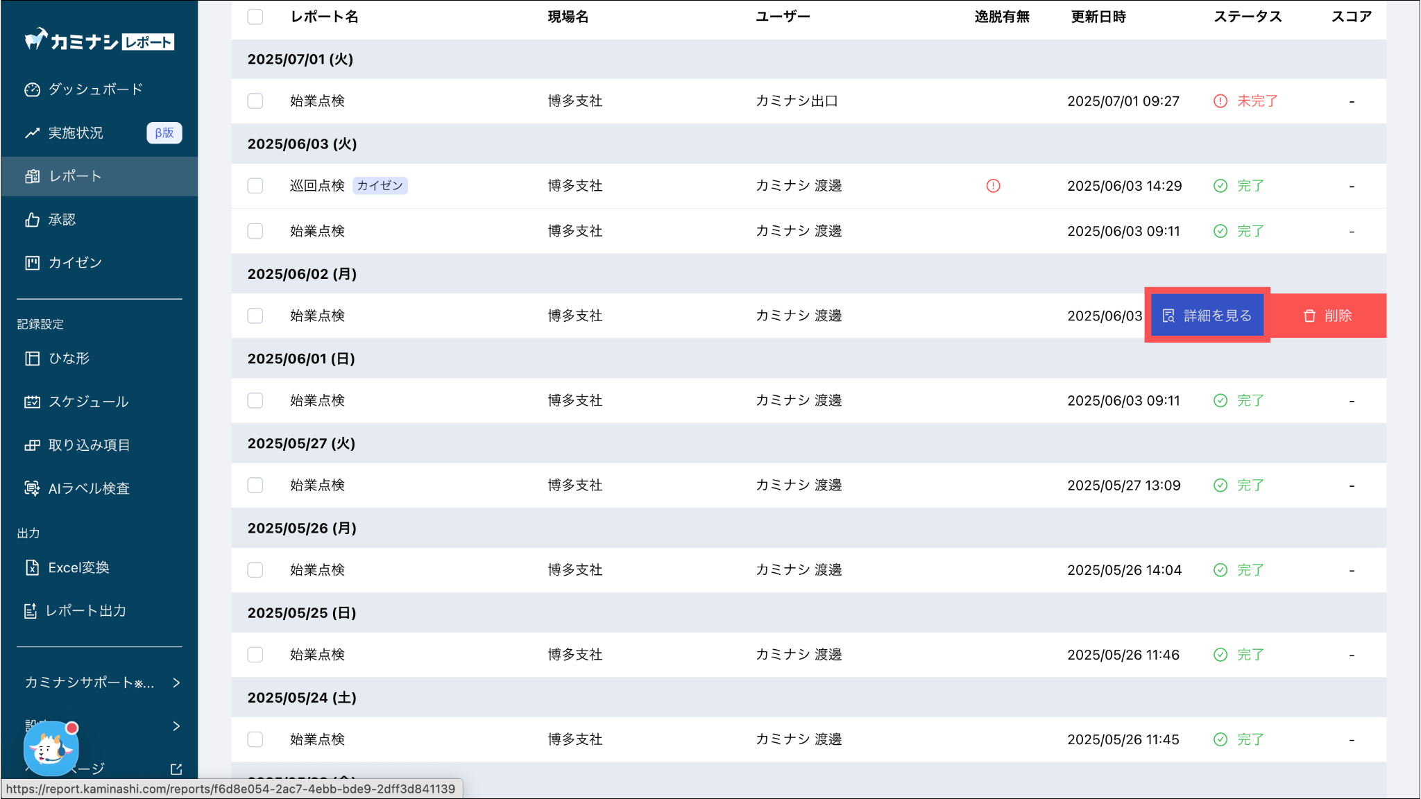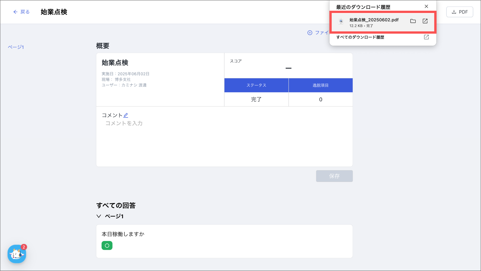 1.カミナシレポート 管理画面にログインする2.「レポート」を開き、ダウンロードするレポートの「詳細を見る」を押す3.「PDF」を押す複数のレポートを一括でダウンロードすることはできかねます。4.ダウンロード履歴からPDFファイルを開く5.PDFファイルが端末にダウンロードされる特殊な文字(絵文字、環境依存文字など)を利用する場合、出力したPDFに反映されない場合がありますのでご注意ください。よくある質問は、こちらからご確認ください。