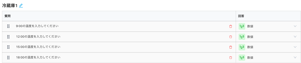 回答形式を「数値」に設定し、ルール設定を行いましょう。ルール設定を活用することで、「○度〜○度の間でなければ違反」「○度以下でなければ違反」「○度以外は違反」など自由に設定できます。