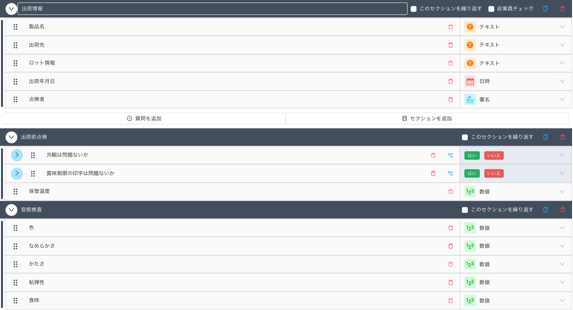 官能検査など選択肢以外の数値評価が必要な場合も、数値ルールを設定することで規定の範囲内で柔軟な記録をすることが可能です。