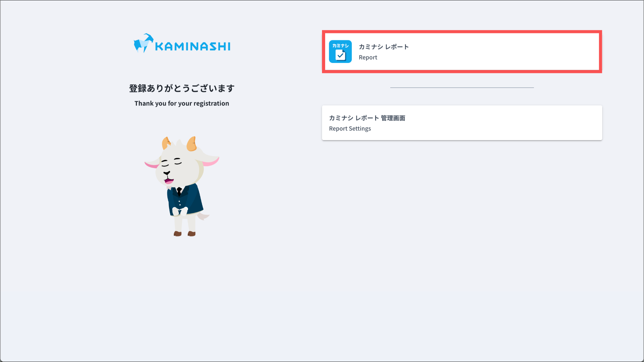 管理画面をご利用の場合は、「カミナシレポート 管理画面」を押してください。