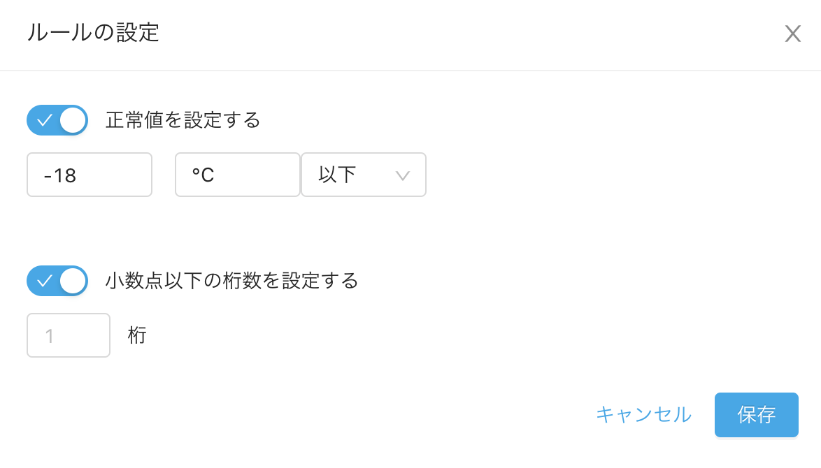 回答形式を「数値」に設定し、ルール設定を行いましょう。「ルールの設定」を行い「○度以下でなければ違反」など記録の正常値を設定することで、定められた温度基準を逸脱していないかを自動でチェックできます。