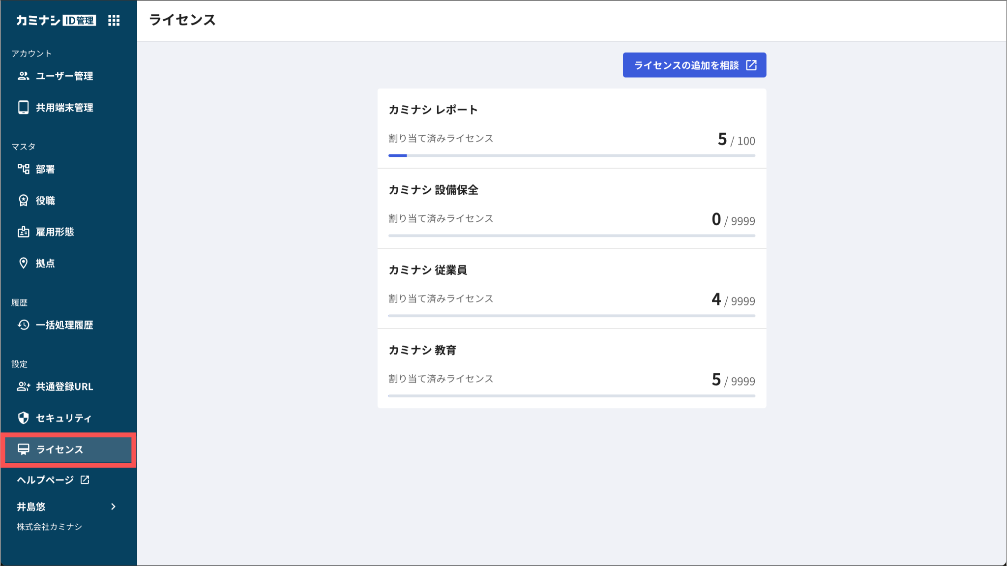 契約ライセンス数を追加する場合は、「ライセンスの追加を相談」からお申し込みください。
