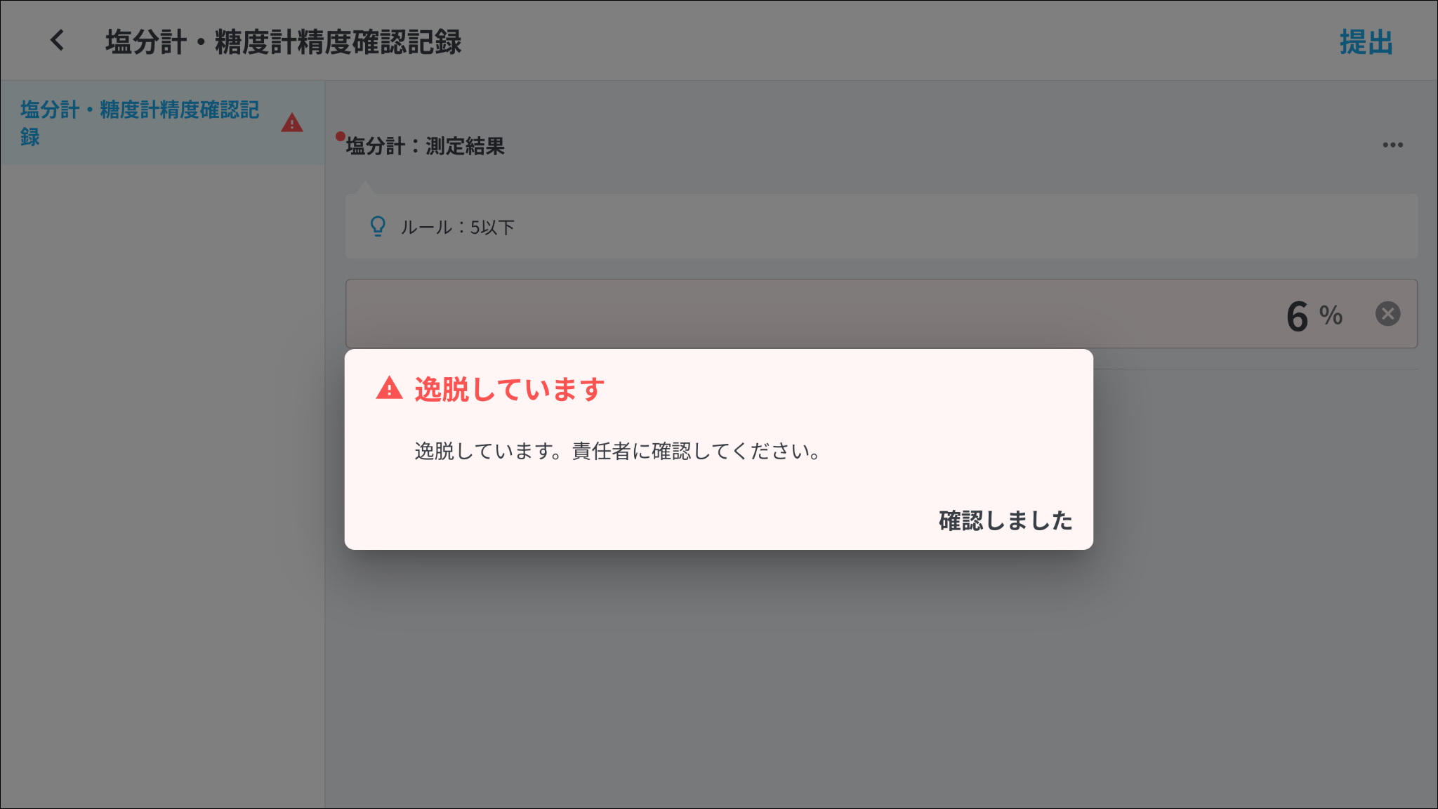 カミナシ上に「ルールを追加」することで、異常値入力された場合にだけ、警告ポップアップを出したり・メールでお知らせすることができます。
