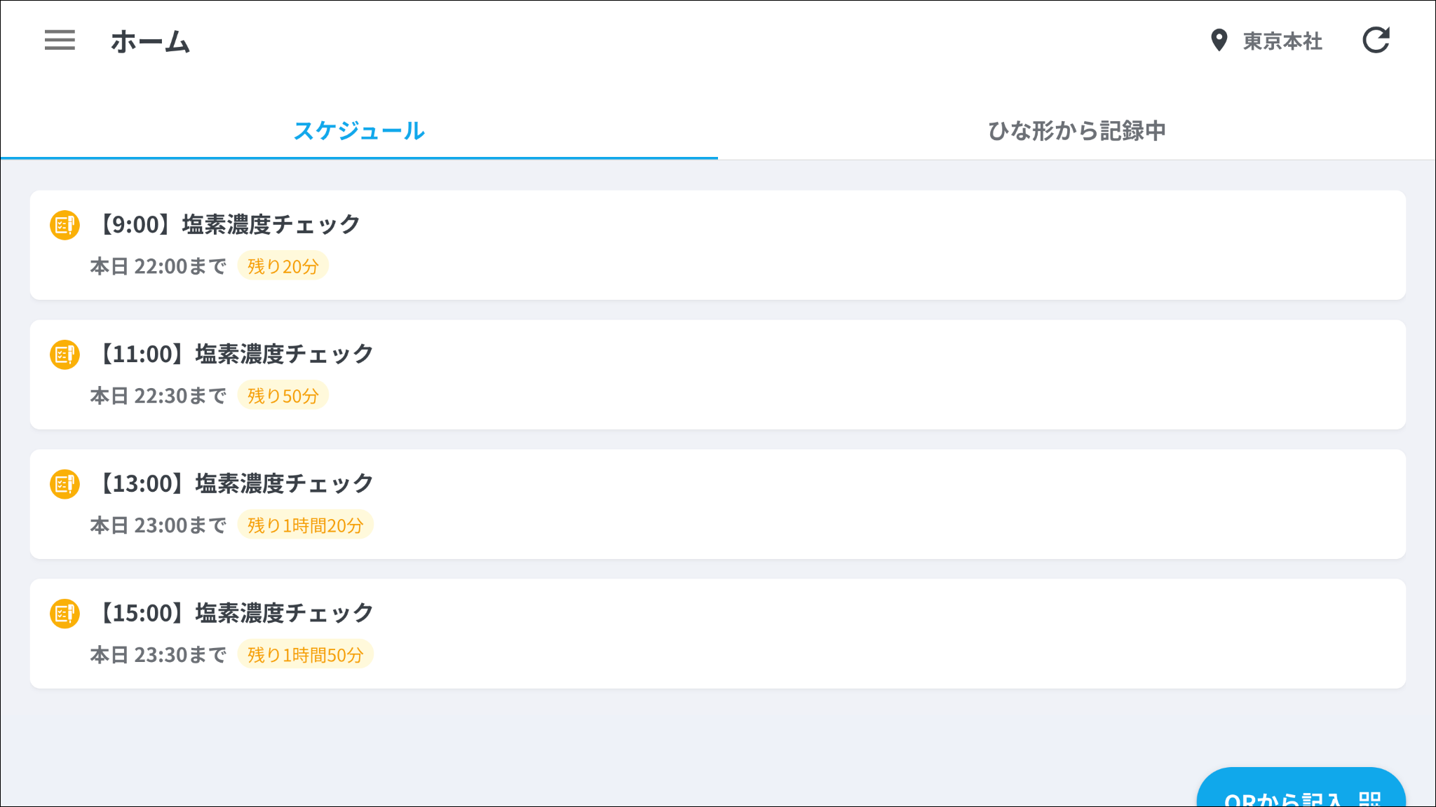 塩素濃度の確認は、決まった時間に測定する場合、1つのひな形に全て入れる帳票もありますが、スケジュールをうまく活用する運用し、時間毎に設定する運用も良いでしょう。