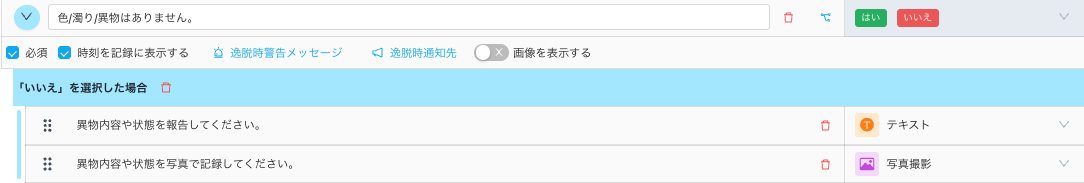 条件分岐を活用し、異常があった場合のみ、テキストと画像で報告できるような設定をしておくと、記録者管理者の視点からも使いやすい帳票になるでしょう。