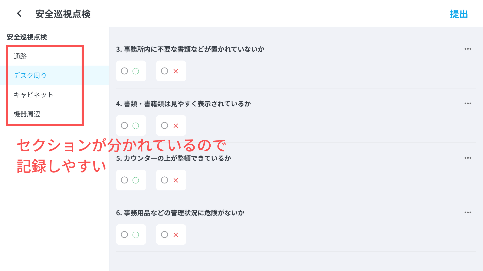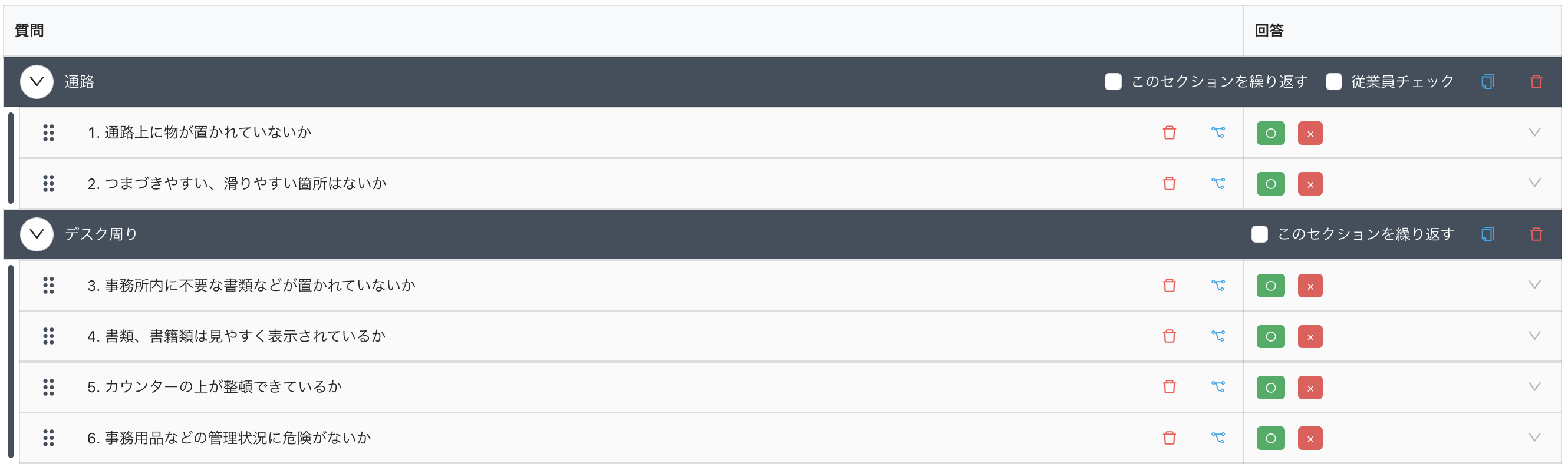 またセクションの順番は実際の点検順序に並び替えておくと、作業しやすい点検表になります。