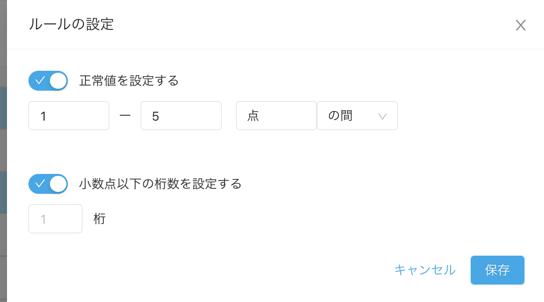 検査項目は数値で入力し「◯点〜▲点」のルールを設定