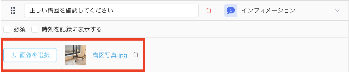 定点撮影記録では、毎回定位置・定角度から撮影することが求められます。記録者が撮影しやすいよう、インフォメーションを使ってお手本の写真を示してあげましょう。質問設定画面でインフォメーションを選択後「画像を選択」クリックし、お手本の写真を挿入しましょう。