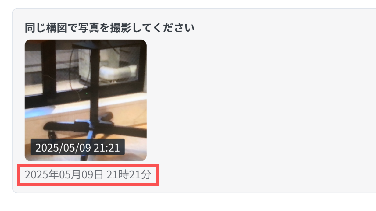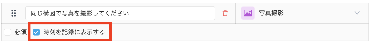 定点撮影記録では、いつその写真を撮影したのか?も一つの大事な情報です。質問作成画面にある「時刻を記録に表示する」にチェックを入れることで、いつ回答したか(=撮影したのか)が残せるようになります。