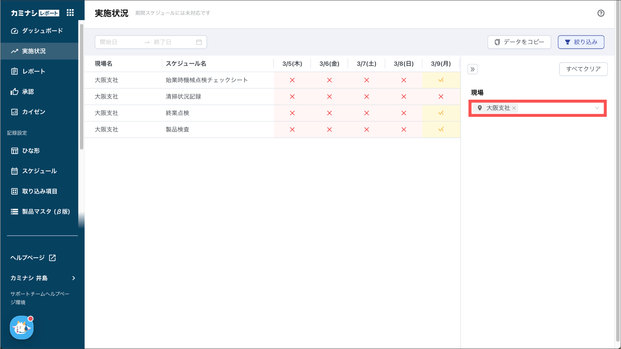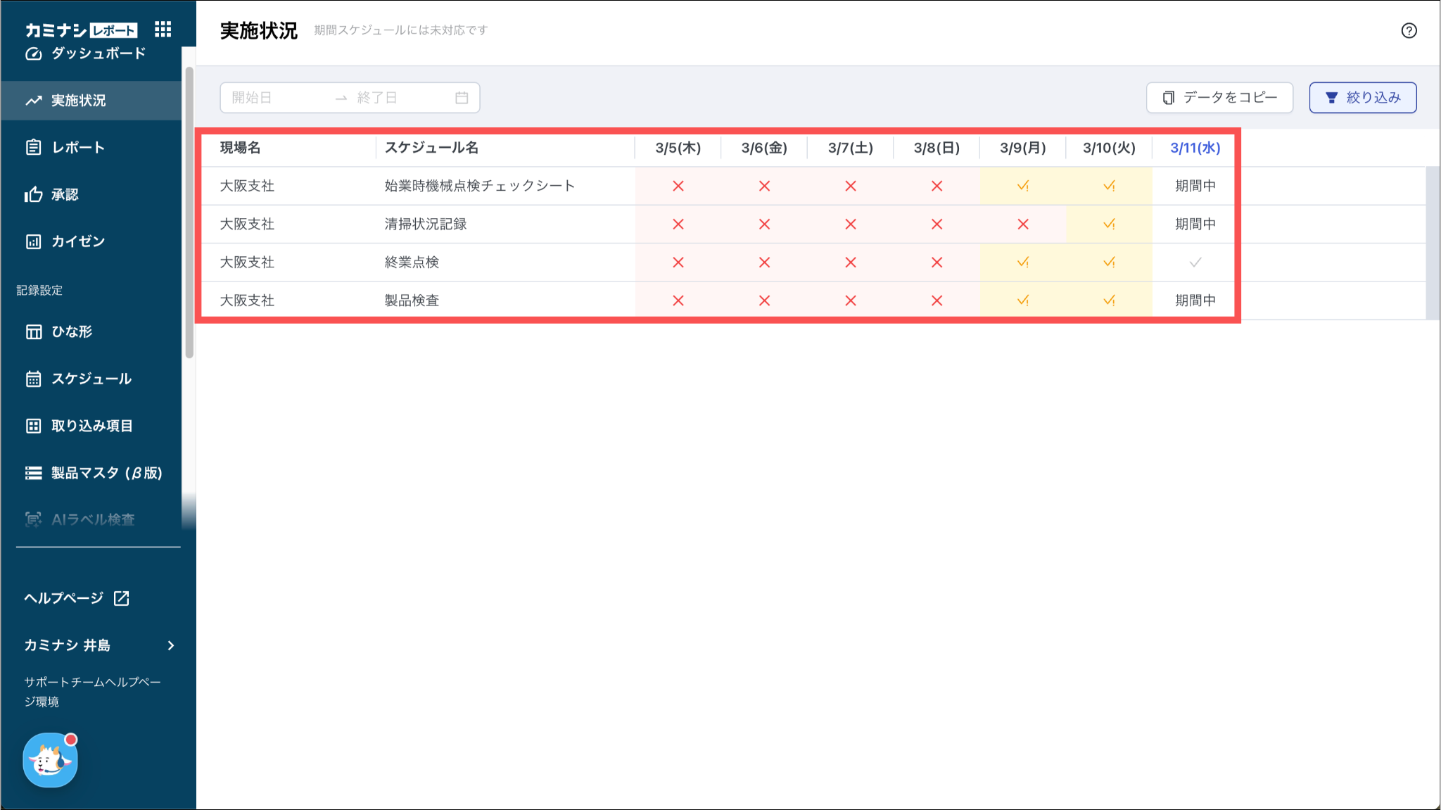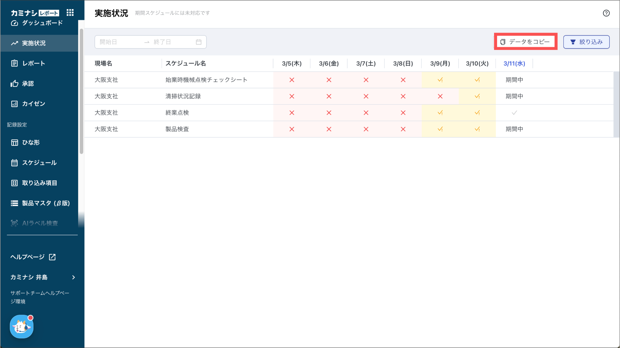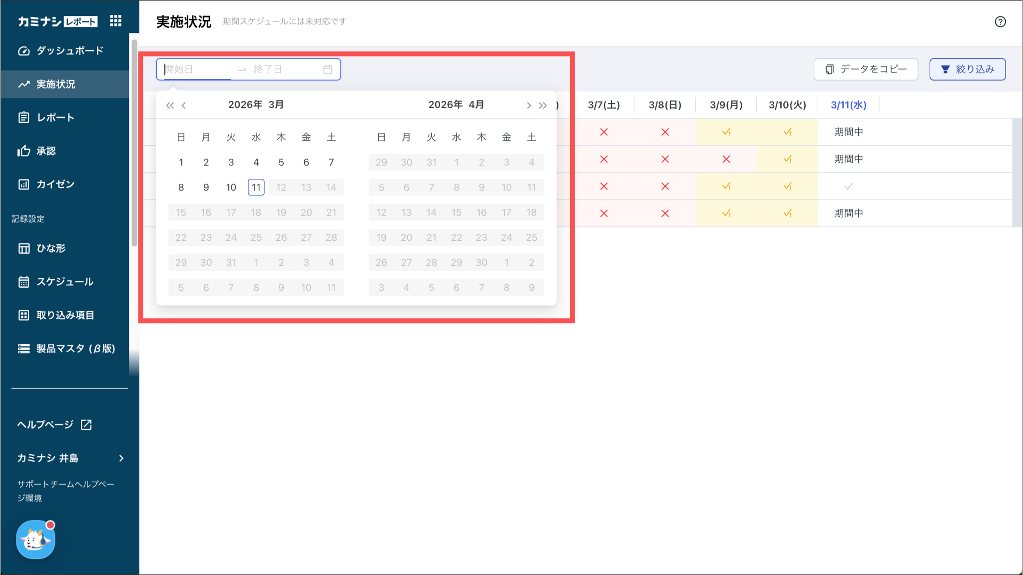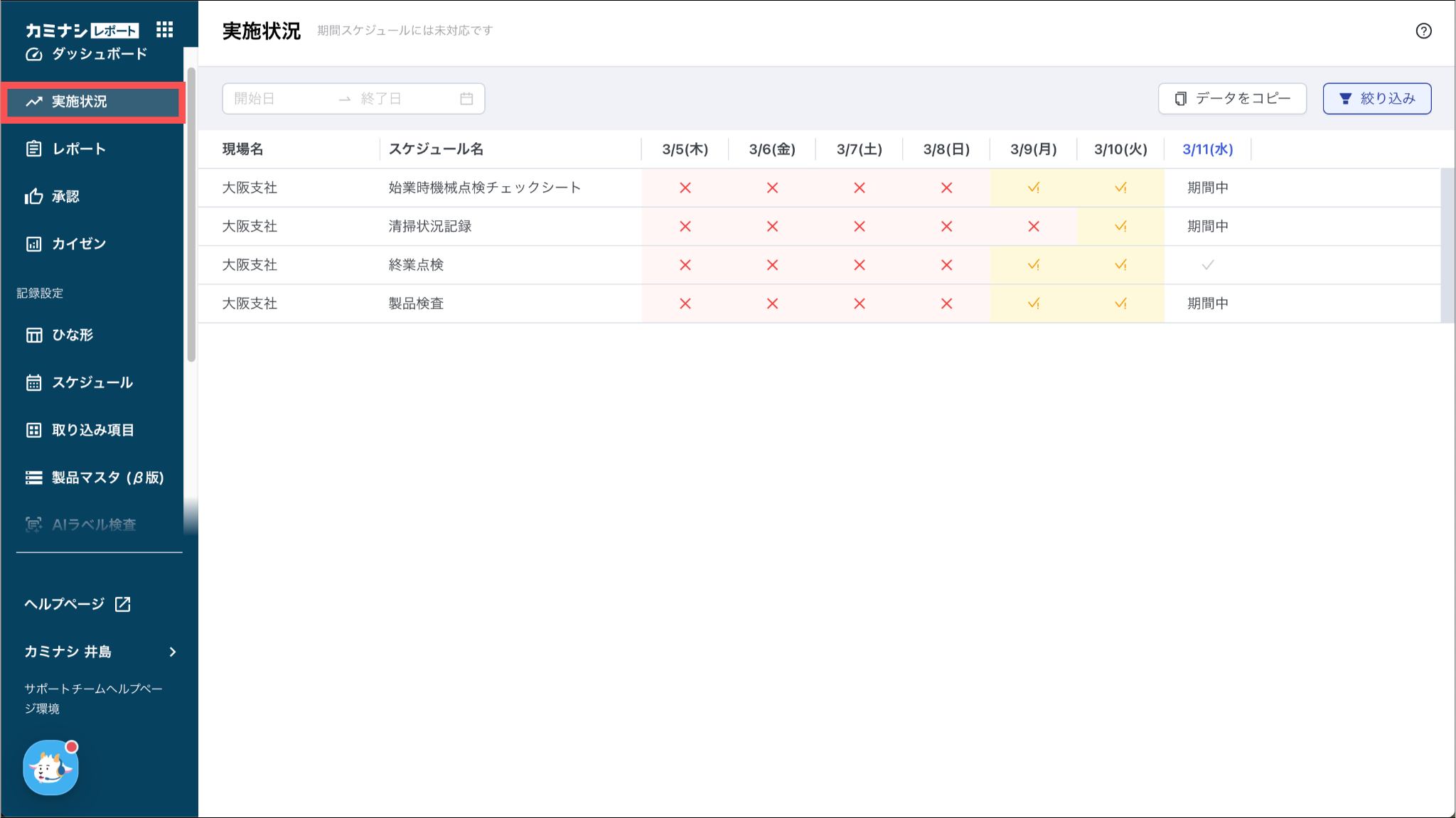 初期状態では直近1週間の実施状況が表示されます。