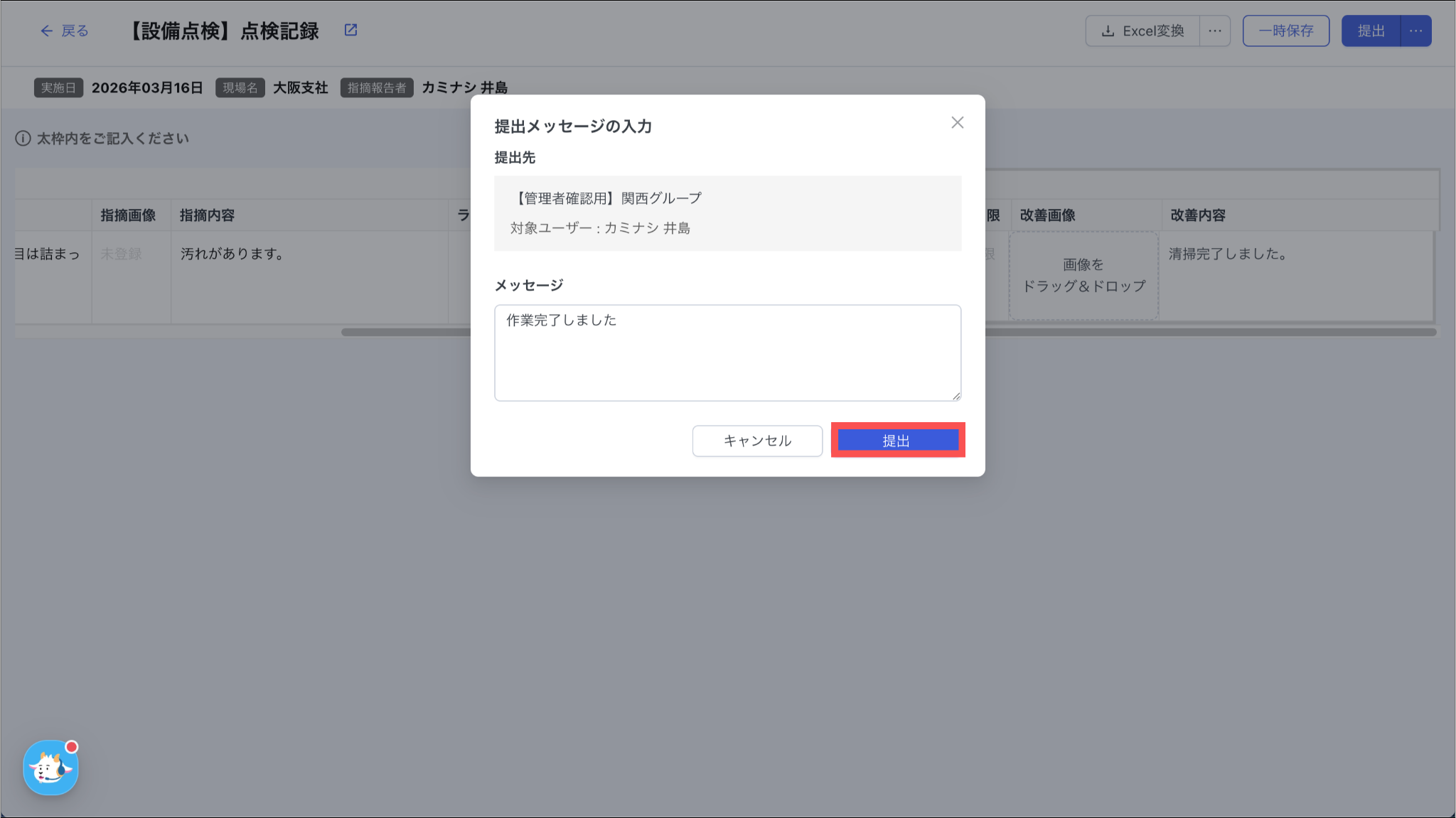 また、監査者が改善を差し戻す際、「提出先」として指定した「ユーザーグループ」にログイン中のユーザーが含まれていないと、改善を再提出することはできません。